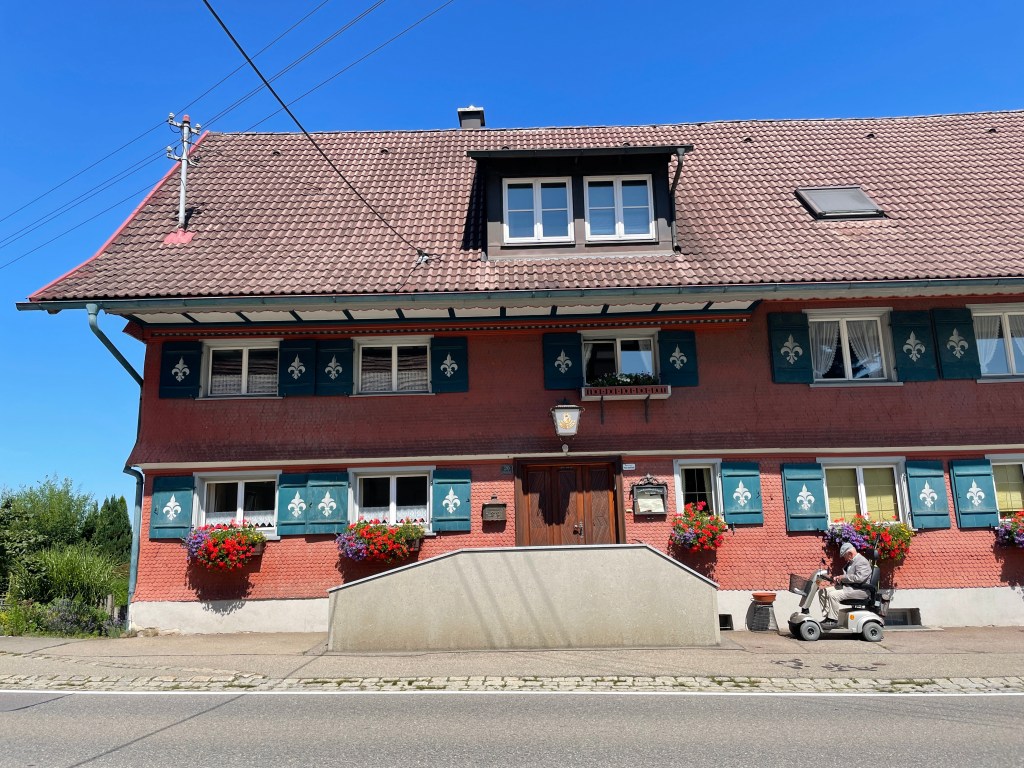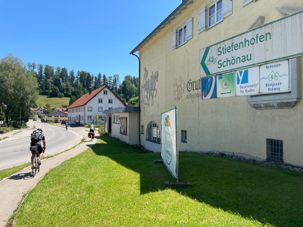 Kurzer Zwischenstopp danach in einem zünftigen Gasthaus mit Wienerle, Weißwürsten und Maultaschen. Danach weiter auf dem Bodensee-Königssee-Radweg. Viel rauf und runter. Die Dorfjugend tuckert mit Oldtimer-Treckern durch diese saftige OA:SE (OA = Oberallgäu) und die Bauern und Bäuerinnen kehren das duftende Gras auf den Feldern zusammen. Idylle beim Vorbeifahren.