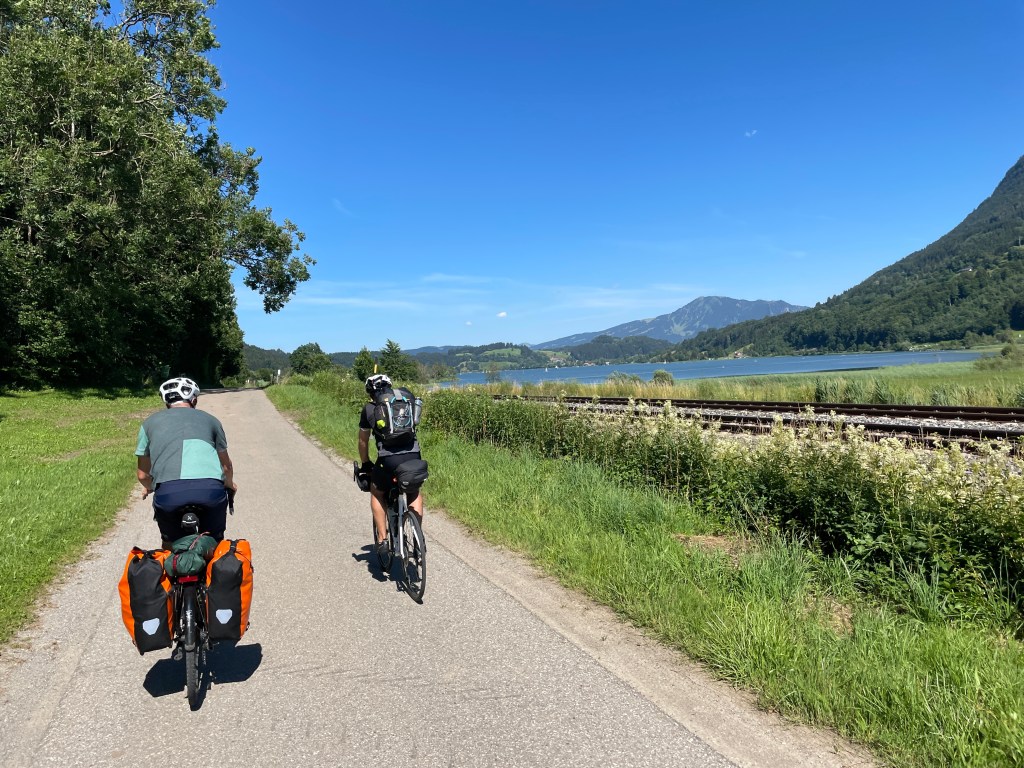 Insgesamt geben wir uns wieder 1.000 Höhenmeter in die Knochen. Da kommt der Alpsee wie gerufen. Hatte den Seenamen noch nie gehört vorher. Wasser, dahinter eine Bergwand. Und die Alpen blitzen immer wieder vor. Unvorstellbar, dass ich erst vor zwei Tagen aus Freiburg losgeradelt bin.