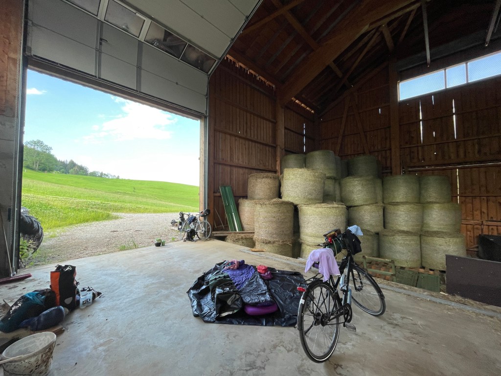 Die Nacht im Allgäuer Heustadl war sehr lauschig. Mitfahrer Adrian hatte den Schuppen über Bekannte klargemacht. Einen Betonboden, ein Holzdach und ganz viel Heuduft in der Nase – das waren die Schlummerzutaten. Draußen blitzte und donnerte es und drinnen klapperte eine Plane an irgendeinen Holzbalken. Ein wohliges Gefühl zu wissen, dass uns die Regentropfen nichts anhaben können. Mitradler Lars hatte sich ganz altruistisch selbst ausquartiert und vor dem Stadl geschlafen – wegen krasser Schnarchlaute. Als der Regen stärker wurde, zog er dann in die andere Ecke des Stalles um. Ich wurde durch sein Röhren zum Glück nicht wach. Auch die Mäuse haben mich in Ruhe gelassen und weder meinen Essensbeutel, noch mich angeknabbert. Nur eine Nacktschnecke sabberte die Unterseite meiner Isomatte voll. Igitt. Und beim Anziehen meines Bustiers kam ein Ohrenkneifer herausgehüpft. Leute, die Abhärtung ist in vollem Gange.