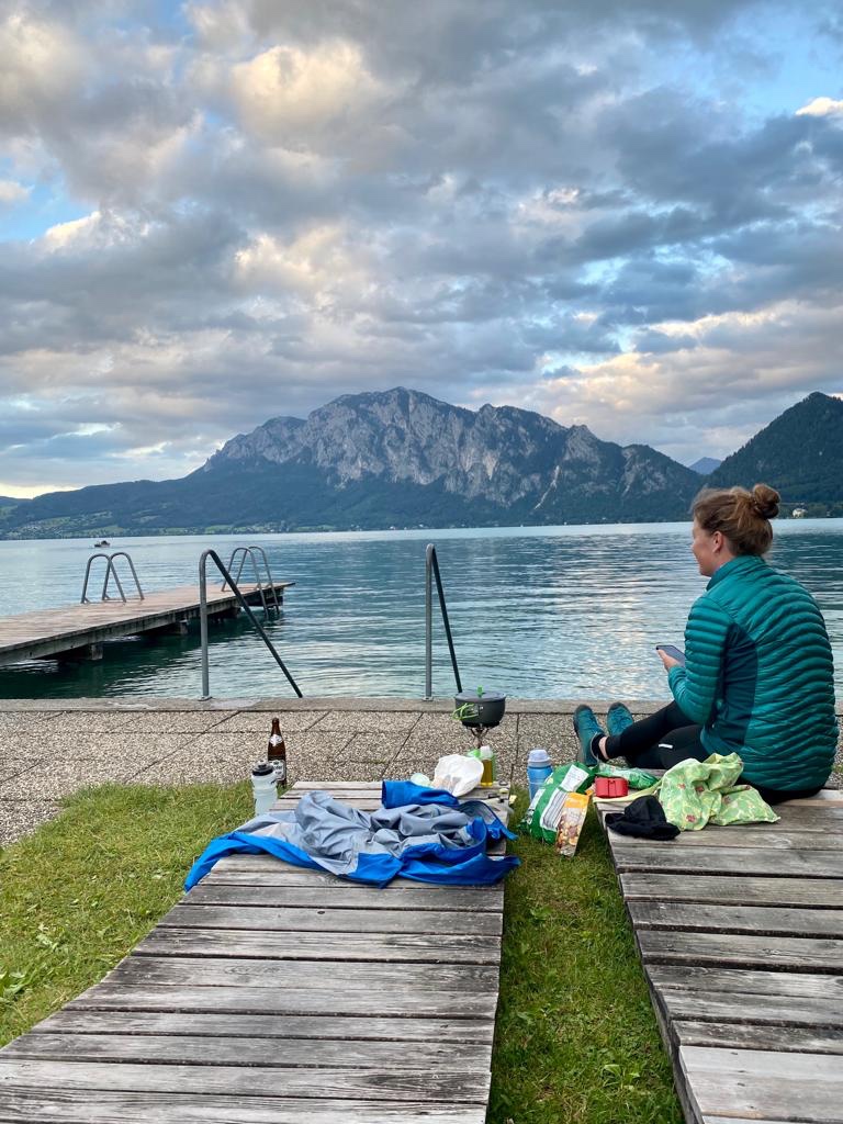 Mit meinem Mitbewohner Lars geht die Reise weiter. Wir wollen raus aus der Stadt. Haben schon Bergweh. Trotz des geplanten Reha-Tages in Salzburg nehmen wir uns 40 Kilometer vor. Einmal durch das österreichische Salzkammergut. Vorbei an der Drachenwand, fast 1200 Meter hoch. Gigantisch und schroff. Gucke schon gar nicht mehr auf die Straße. Ein riesiger Drache soll der Legende nach Menschen aus dem Tal um die Ecke gebracht haben…bis ein besonders mutiger und tapferer Ritter den Drachen besiegte und die Talbewohner vom Feuerspeier erlöste… wir radeln dann mal schnell zum Camping am Attersee. Man kann ja nie wissen…
