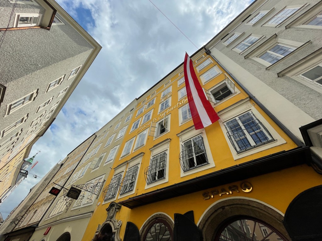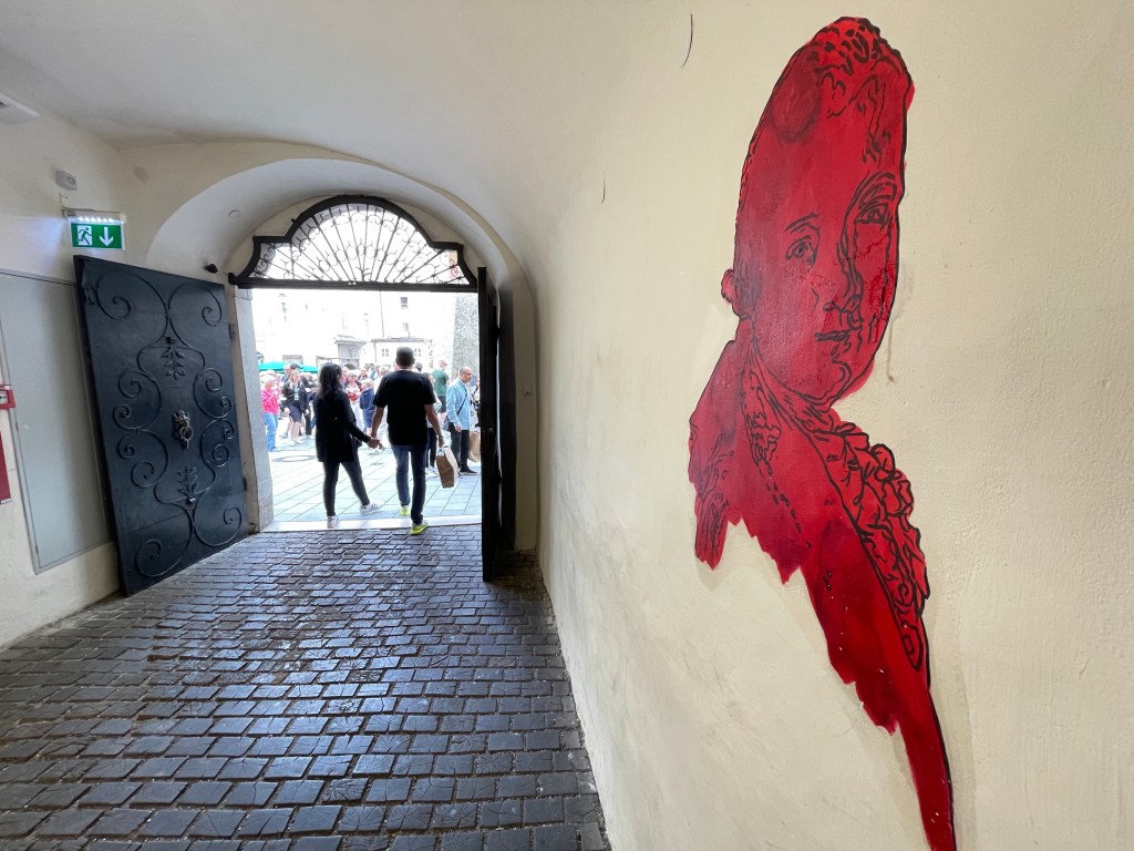Vom Kaffeehaus auf die Gass‘ zu Mozarts Geburtshaus, erkennbar an den vielen Touris mit gezückten Smartphones und gereckten Hälsen. Getreidegasse 9, hier ist Mozart am 27. Jänner 1756 zur Welt gekommen. In welchem die Wohnung seiner Eltern war, weiß ich nicht. Im Erdgeschoss ist jedenfalls ein „Spar“ eingezogen. Ob Mozart das gefallen hätte?