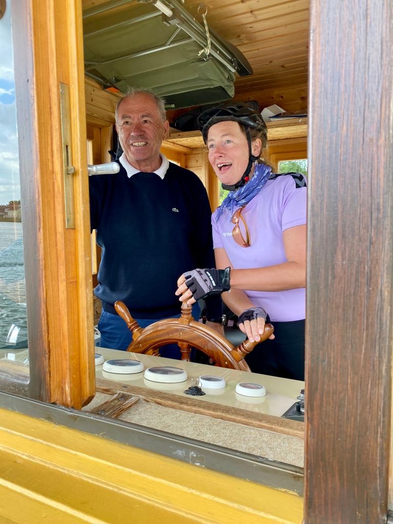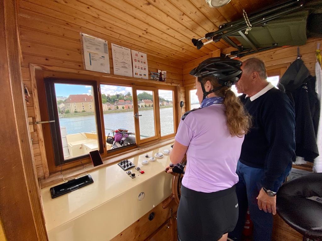 In der Nähe von Mauthausen müssen wir die Donauseite wechseln. Ein Fährmann mit Marine-Pulli und warmherzigen Augen empfängt uns auf seinem Kutter. 300 Radler habe er gestern an das andere Donau-Ufer gebracht, heute sei wenig los, zu viele Wolken am Himmel berichtet er. Wir kommen ins Plaudern. Ich erzähle von meinen Reiseplänen. „Nach Georgien? Was wollens denn da?“ Wenn es nach ihm ginge, ist Österreich die Endstation. Fährfrauen werden ohnehin gesucht. Wohl nur Männer hinterm Steuerrad. Für die Überfahrt überlässt er daher mir das gebeizte Holzrad. Den gegenüberliegenden Steinsteg zu treffen, unmöglich für mich, also übernimmt er wieder. Die Fähre, für ihn ein Spielzeug, sagt er.