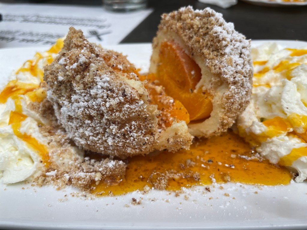 Wir spulen die Kilometer herunter und der Wind drückt uns nach vorne. Zwischenstopp bei Manuelas Imbiss. Mehrere ältere Herren knabbern an so runden Bollen. Will ich auch! Und wieder ein Fest für die Geschmacksnerven. Bekomme zwei warme Marillenknödel mit zuckrigen Haselnussstreuseln und Sahne serviert. Mitfahrer Lars hat eine Nussallergie und bekommt nackte Knödel.