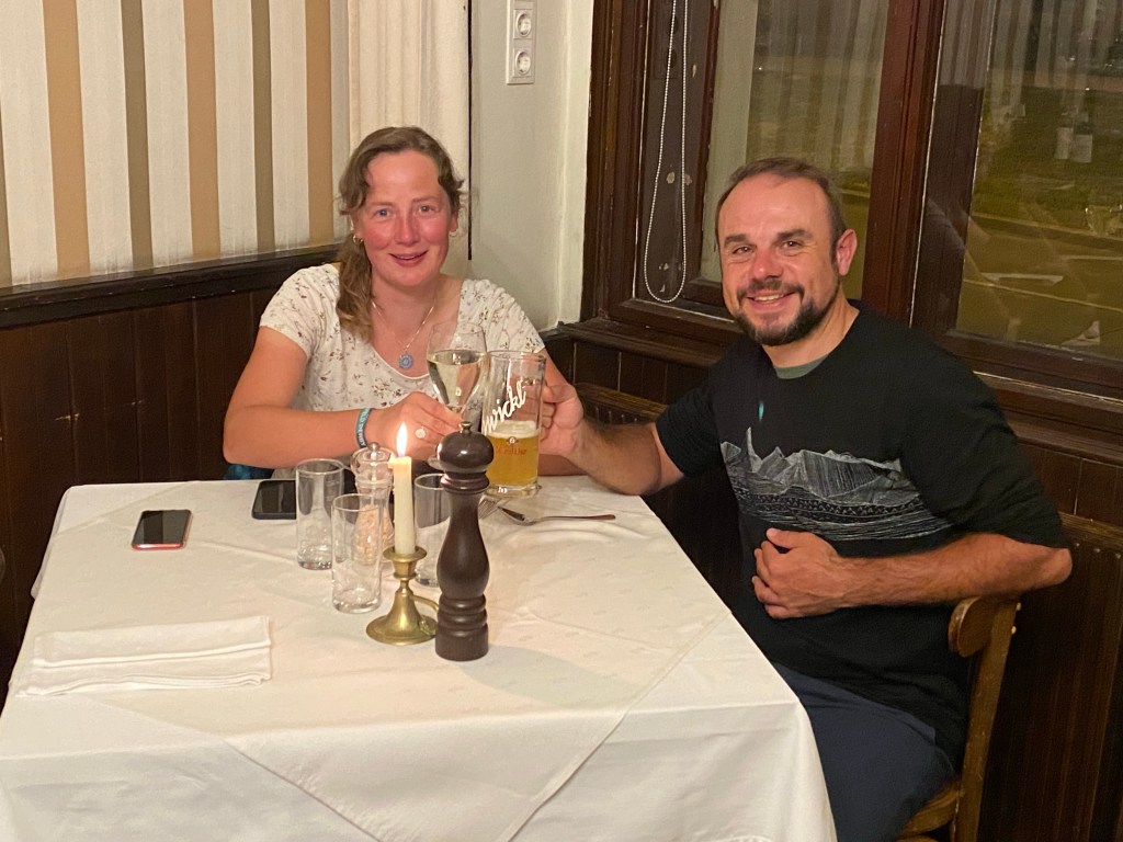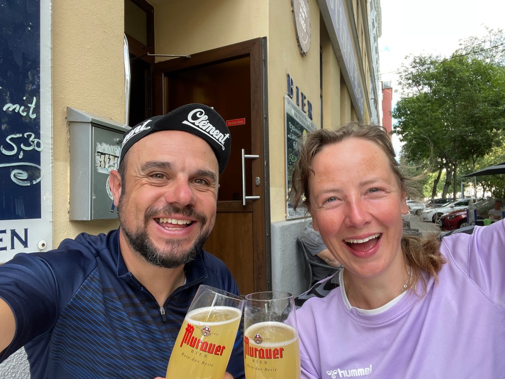 Wir geben uns ein Tempo-Battle mit zwei Gravelbikern und machen noch eine Pause am Donauufer. Wien, noch 35 Km. Vamos! Mein Energielevel sinkt und sinkt. Auch die Konzentration. Ampeln, Kreuzungen, Zebra-Streifen. Ich bin im Tunnel. Noch einmal in den Riegel beißen und die letzten zehn Kilometer anpacken. Die Donau hält uns die Treue – bis wir in den 20. Wiener Bezirk abbiegen. Meine Freundin Gudrun grüßt uns aus ihrem Fenster heraus. Wir stehen ganz verdattert auf dem Bürgersteig. Wirklich in Wien? 11 Tage, fast 1.000 Kilometer in den Beinen. Zwischenziel erreicht.
