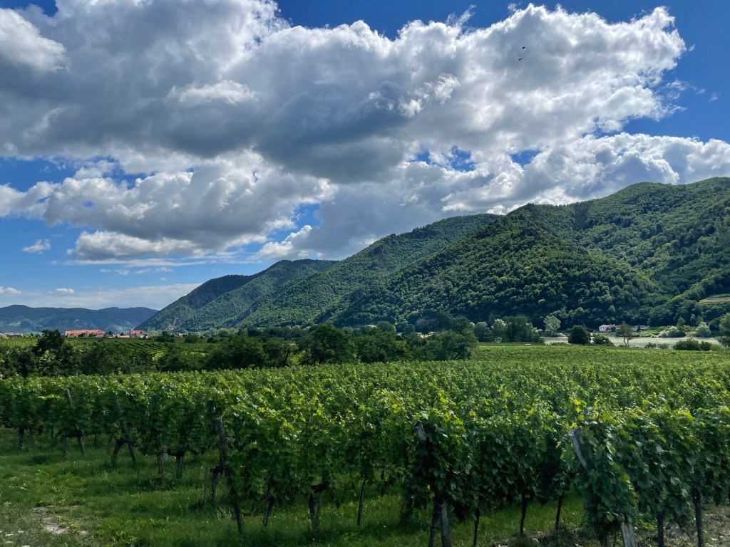Alle Zeichen stehen auf Kurbeln. Zuerst durch die Wachau. Ein malerisches Donautal mit felsigen Hängen, saftigen Reben und netten Bullen. Von zweien sind wir angehalten worden, weil wir auf einer schnelleren Straße unterwegs waren. Die Herren weisen uns den Weg zum Radpfad und zur nächsten Bäckerei. Top Service!