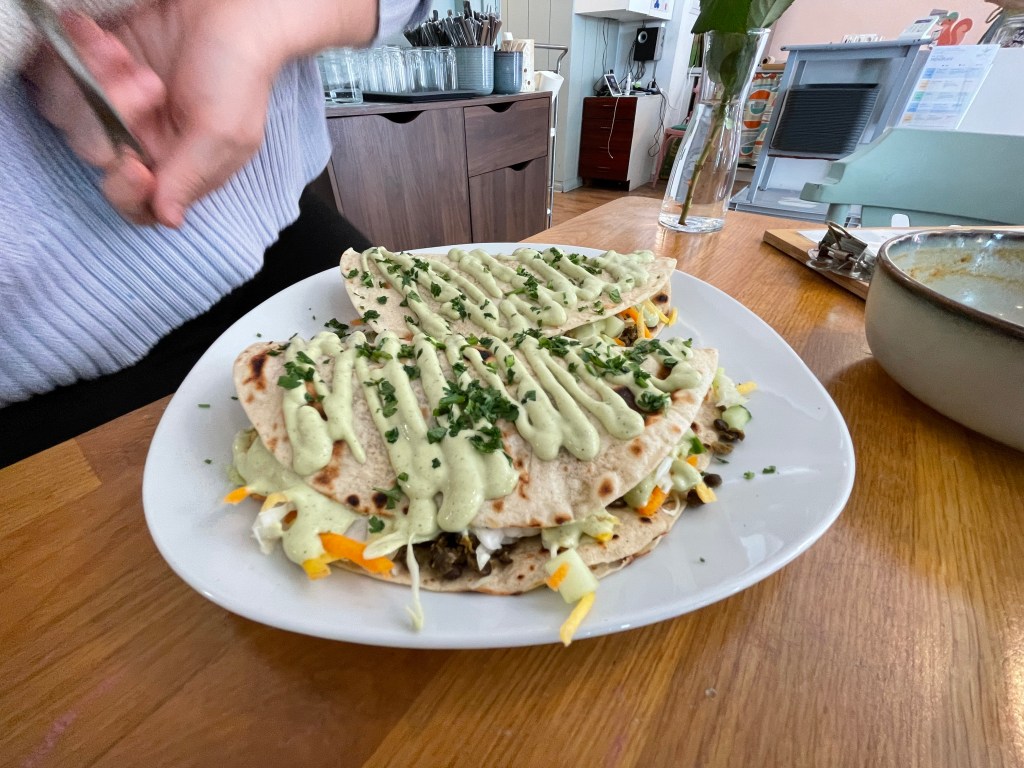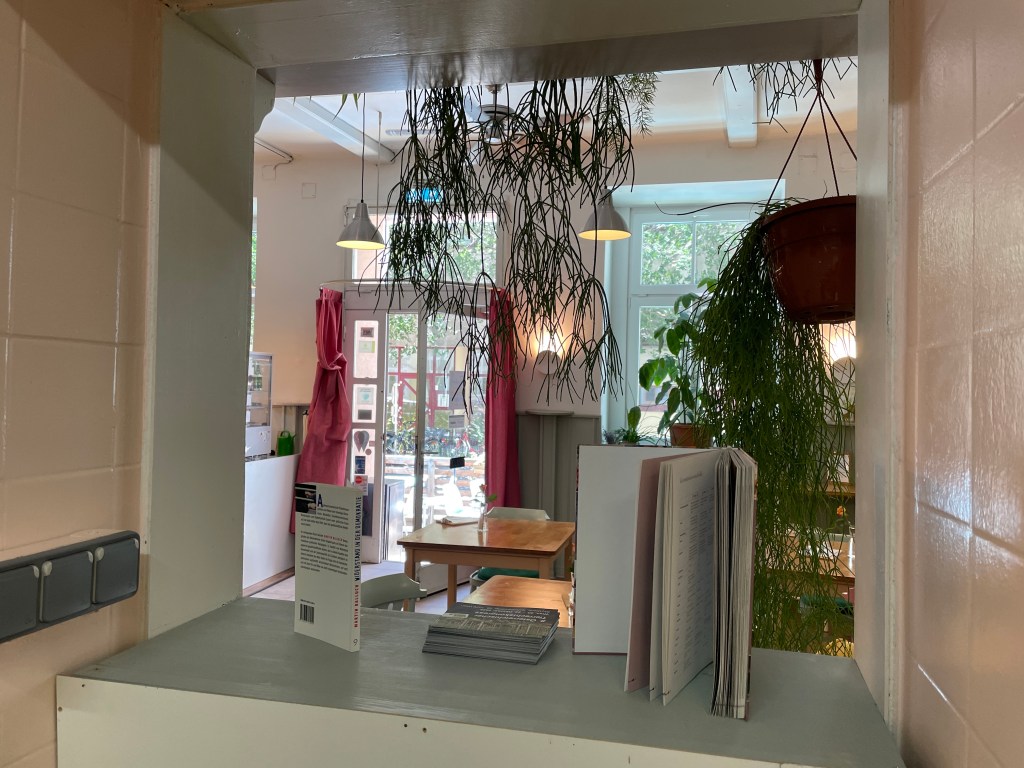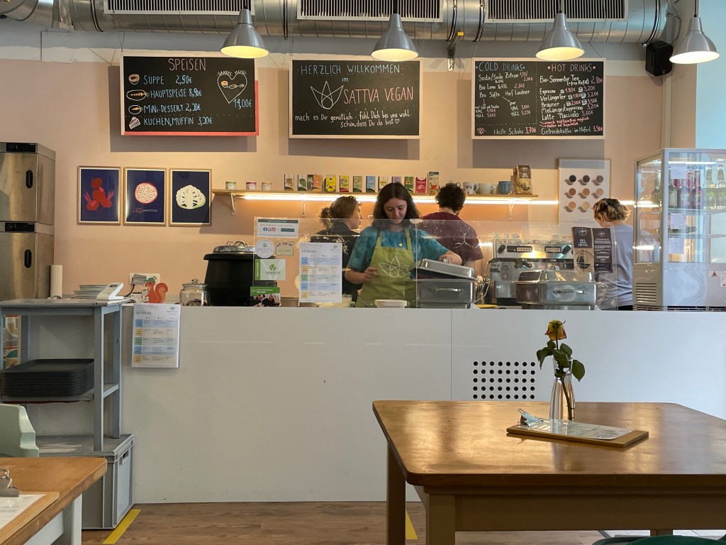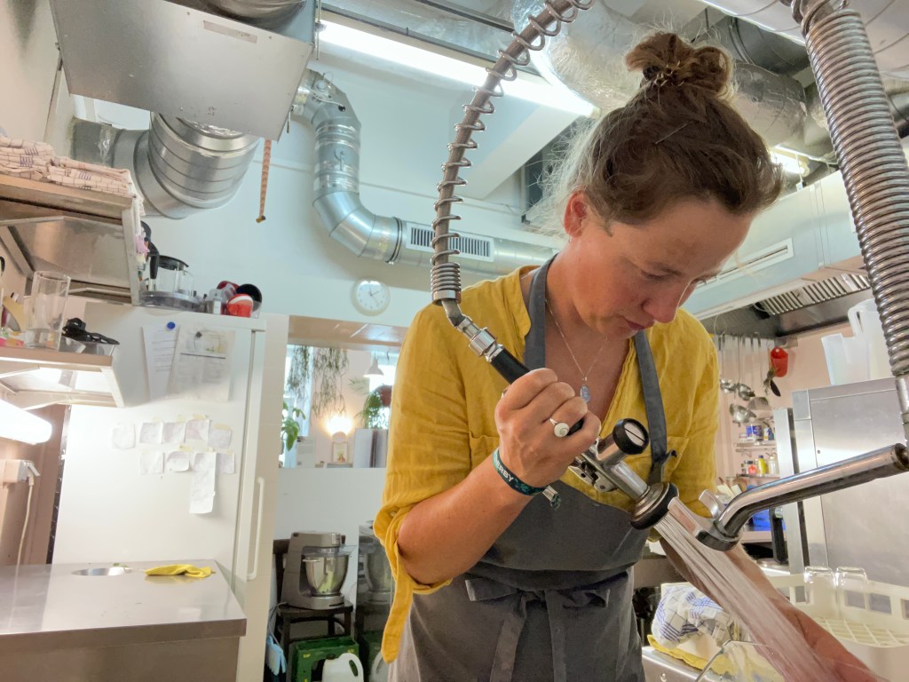 Zum Glück habe ich am Gleis gar keine Zeit für Augen-Pippi. Muss los. Zum Sattva in den dritten Wiener Bezirk. Der Darling von meiner Freundin Gudrun hat dort ein veganes Restaurant eröffnet. Er war vorher Software-Entwickler. Das „Wie es zu dieser Wandlung kam“ muss ich noch aus ihm herauskitzeln. Jetzt aber erstmal zum daily Business: Die Thekenkraft und die Spülhilfe sind kurzfristig ausgefallen, also habe ich meine Hilfe angeboten. Schichtbeginn ist um 12 Uhr. Bekomme eine graue Schürze und eine kurze Einführung in die Spülmaschinen-Technik. Mit dem Kratzerl, sagt Gudrun, soll ich die Töpfe sauber schrubben. Verstanden! Salatschleudern, Siebe, Suppenkellen – alles wird reine gemacht. Was die Spül-Skills anbelangt, kann ich auf Vorerfahrungen zurückgreifen: Nach dem Abi habe ich in einer elsässischen Jugendherberge Berge an Tellern und Geschirr weggespült. Das war Teil eines FSJs.