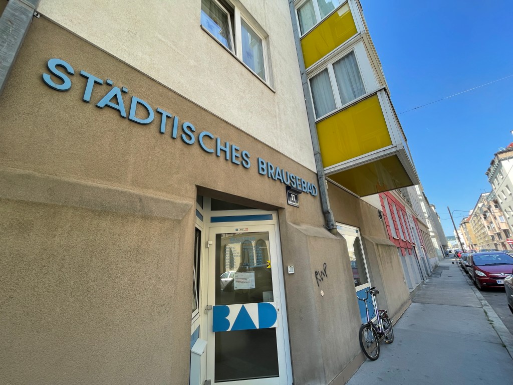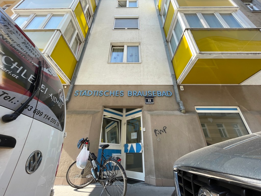 Brausebäder haben eine lange Tradition in der Stadt. 1887 eröffnete das erste Brausebad in Wien. Rund 75.000 Badegäste stellten sich im ersten Betriebsjahr unter die Brausen – laut Wiener Zeitung. Dabei wurden die Wasserleitungen ganz schön strapaziert, was dazu führte, dass manchmal nur Tröpferl aus den Köpfen herauskullerten, deswegen auch „Tröpferlbad“. Heute passiert das nimmer. Meine Dusche läuft und läuft. Angenehm warm auf der Haut. Und auch behaglich, das Klacken der Kabinen und Prasseln der anderen Duschen zu hören. Viele Bauarbeiter kommen wohl hier hin, aber auch Stammgäste mit Stammkabinen. Und Reisende. Die Dame an der Kassa erzählt, dass gestern zwei Tramper da gewesen seien, auf dem Weg von Rumänien nach München.