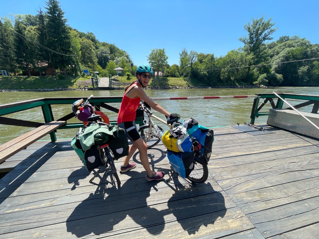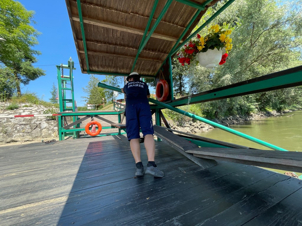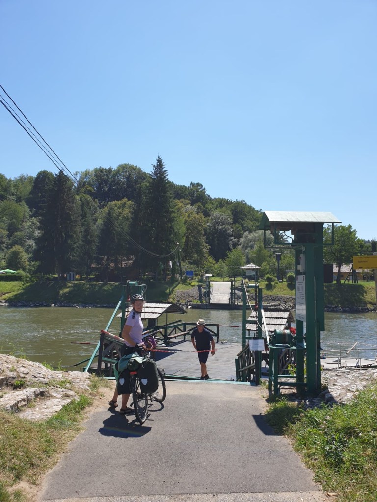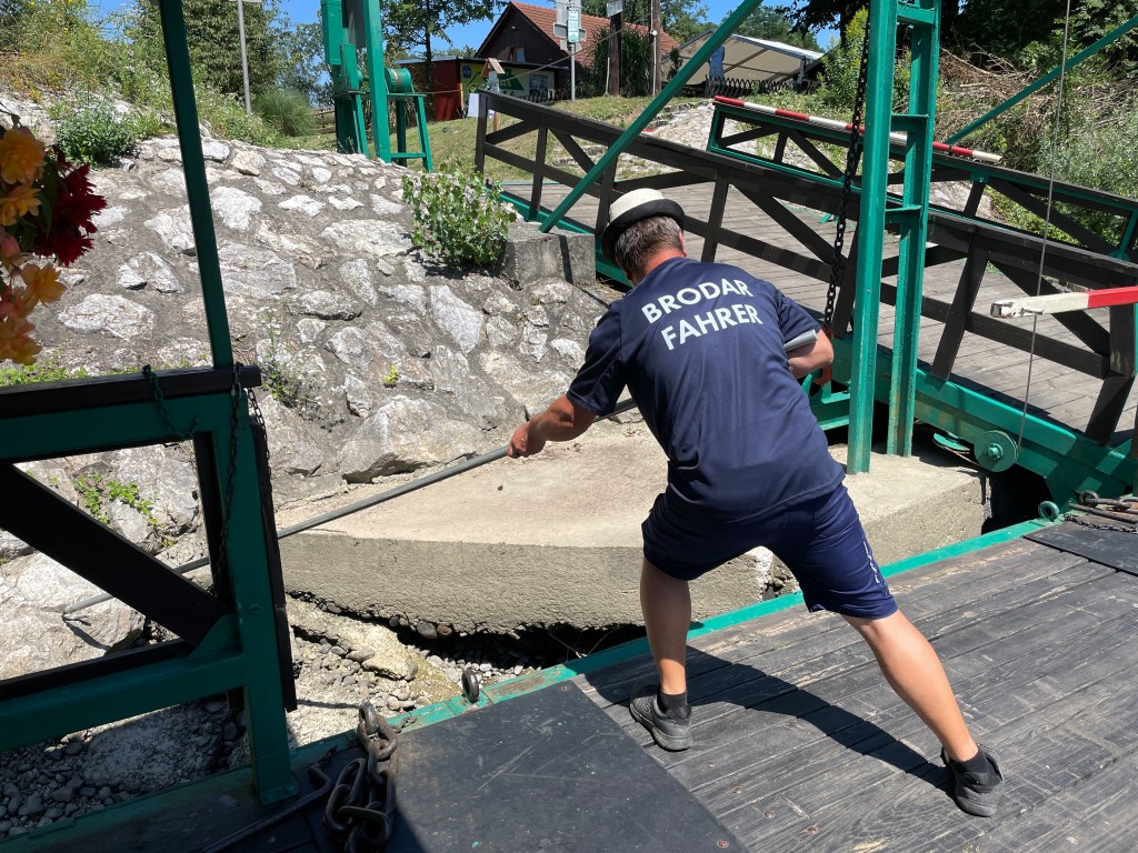 Die Grenze zwischen Weitersfeld in der Südsteiermark und dem slowenischen Ufer ist flüssig und heißt Mur. Wer den Strom überqueren will, nimmt eine kleine Fähre. Leichter gesagt, als getan. Unser Fährmann hat sich eine Viertelstunde lang abgemüht. Die Fähre hatte wohl zu wenig Wasser unterm Bauch und kam nicht weg. Der Fährtyp hat immer wieder versucht, den Kahn mit einer langen Stange vom Ufer wegzudrücken. Auch Jacky und ich haben Einsatz gezeigt und uns von der Fähre aus gegen die Poller am Ufer gestemmt. Irgendwann flutschte es. Und unsere Räder landeten auf slowenischem Boden.