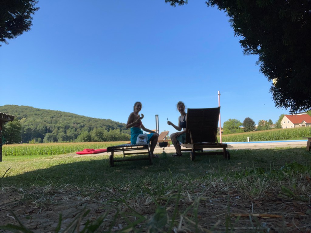 Morning has broken im Campingplatz-Pool: Augen schließen, paddeln, die ersten Sonnenstrahlen spüren. Großes Urlaubsgefühl. Danach Frühstück auf den Liegestühlen und Abschied von den Dauercampern. Heute lassen wir Österreich hinter uns. Die Kilometer ziehen an uns vorbei und die Köpfe hinken hinterher. Können es gar nicht fassen, dass uns die Räder schon so weit getragen haben.