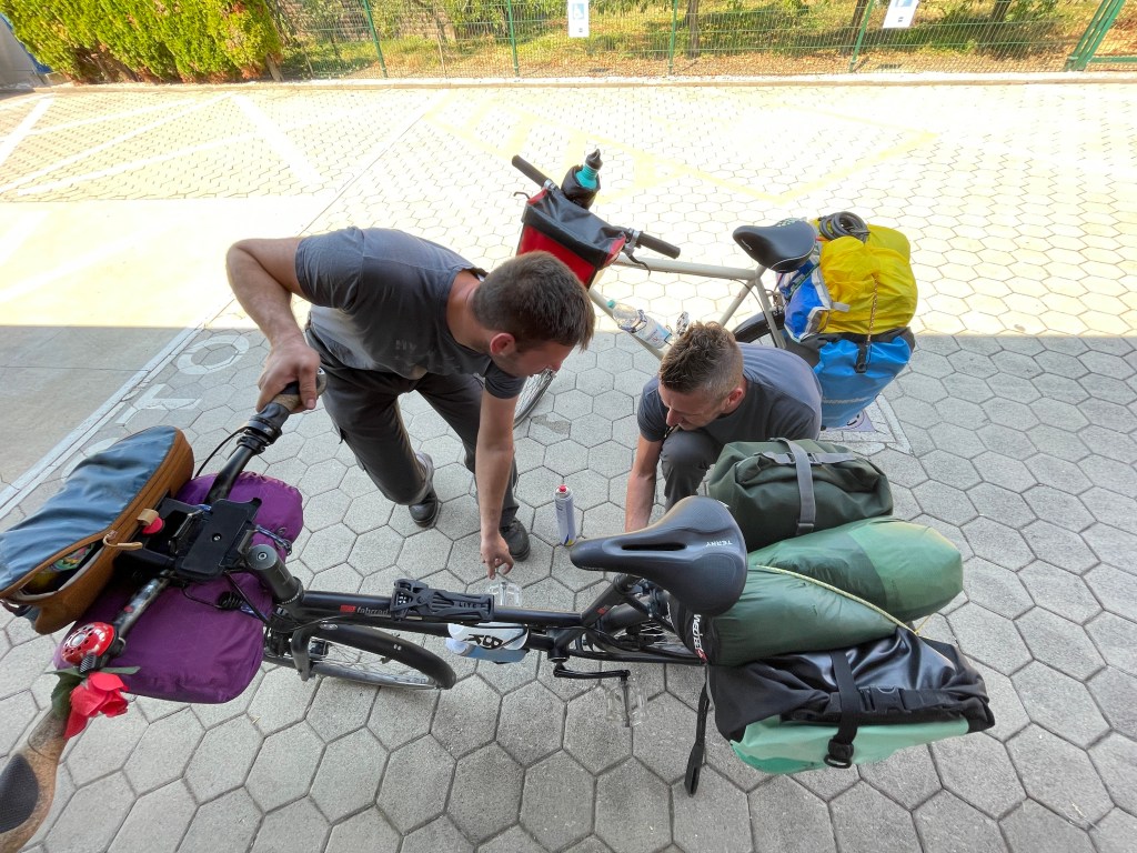 Achja, übrigens: Bisher lässt es sich prima Radeln in Slowenien. Die Wege zwischen den Dörfern sind gut geteert, wenig los auf der Straße. Landschaftlich alles bisschen wilder als in Österreich. Da liegt auch mal eine Bierdose auf der Wiese. Und wenn die Fahrradkette mal einen Spritzer Öl oder Spray braucht, sind hilfsbereite Automechaniker zur Stelle. Im Nu gehen sie vor deinem Rad auf die Knie und regeln das mal schnell. Große Konversationen wird es nicht geben. Die Englisch-Kenntnisse reichen nicht an die Schrauberfertigkeiten heran.