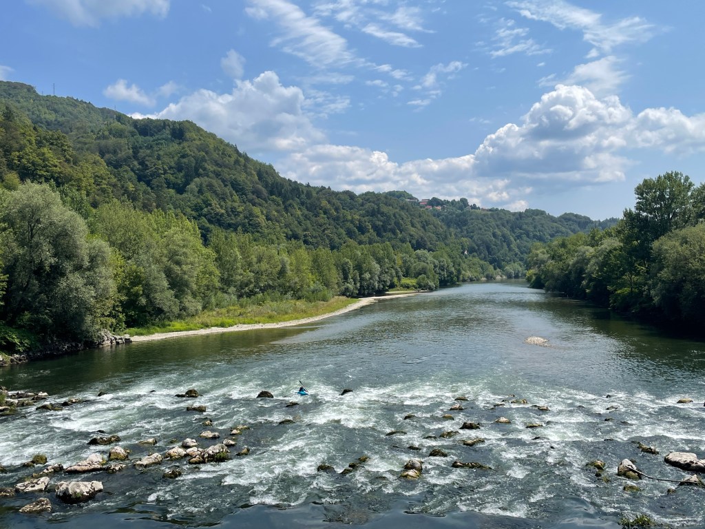 Dosenbier für die Junggesellen-Freunde, Müsli mit Banane und Studentenfutter für Jacky und mich. Zwei Welten an einer Biertischgarnitur. Was uns eint: die kleinen Augen und die busy Enzyme in unseren Lebern. Bis 2 Uhr nachts haben wir gestern mit den slowenischen Dorfjungs gefeiert. Sechs Spritzer (Weinschorlen) werden es gewesen sein. Oder mehr? Einen Kater haben wir zum Glück nicht. Und viele Kilometer werden es heute auch nicht. Ganz gechillt cruisen wir am Fluss Save entlang und werden so in die slowenische Hauptstadt gespült.