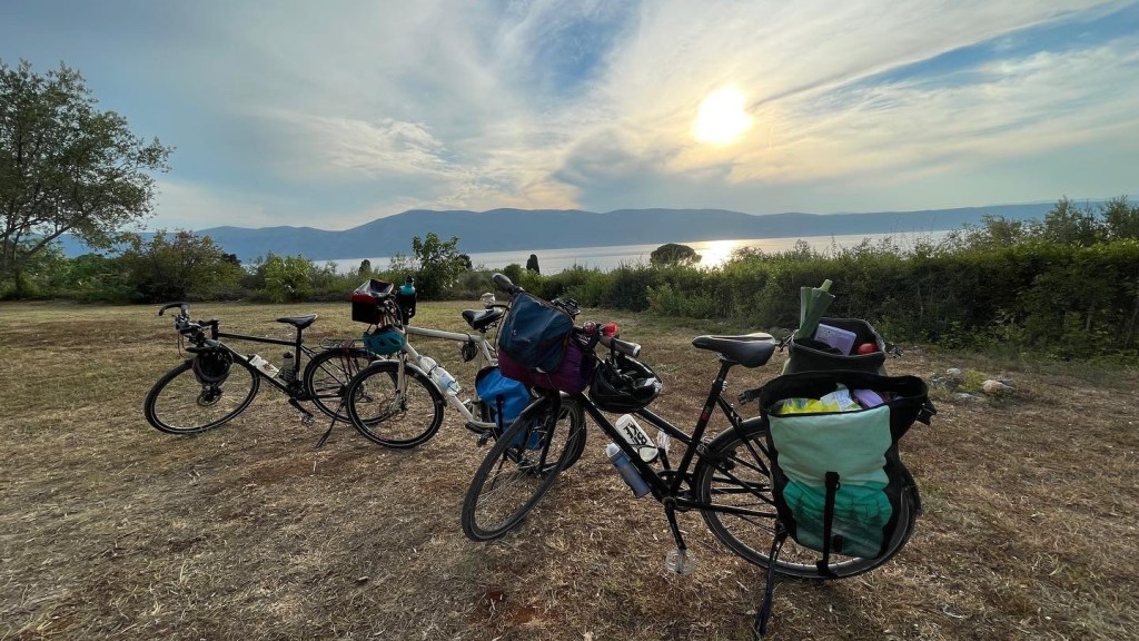 Die hübscheren Fleckchen auf der Insel Krk sind wohl auf der Westseite, da, wo das Meer ist. Wir radeln durch die Mittagsglut. 200 Höhenmeter fühlen sich wie der Feldberg an. Freundin Jacky will nimmer – was total verständlich ist. An einer Kreuzung strecken wir unsere Daumen raus. Und zack, ein Treffer. Ein netter Typ in Latzhose mit Einsatzfahrzeug hält an und hievt Jackys Rad auf das Autodach. Neue Erkenntnis: Trampen mit Bikes geht voll!