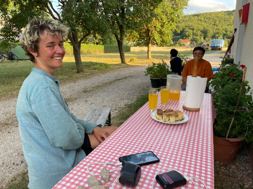 Bei Kilometer 75 kommen wir an mehreren Bauernhöfen vorbei. Zwei ältere Ladies winken uns zu. Zack, Rückwärtsgang. Wir fragen, ob wir bei ihnen zelten dürfen. Klar, wo immer, wir wollen. Voll unkompliziert. Die eine Dame, die Bäuerin, hilft uns sogar beim Zeltaufbau, bringt einen Hammer zum Heringereinkloppen. Dann gibt es selbstgemachten Strudel und Limo. So herzlich! Wir verständigen uns mit Händen und Füßen. Müssen lachen. Sie freut sich, dass wir so viel verdrücken.