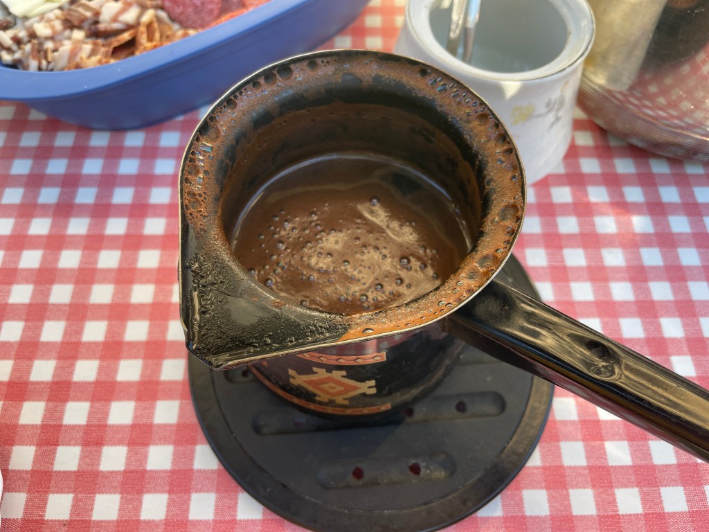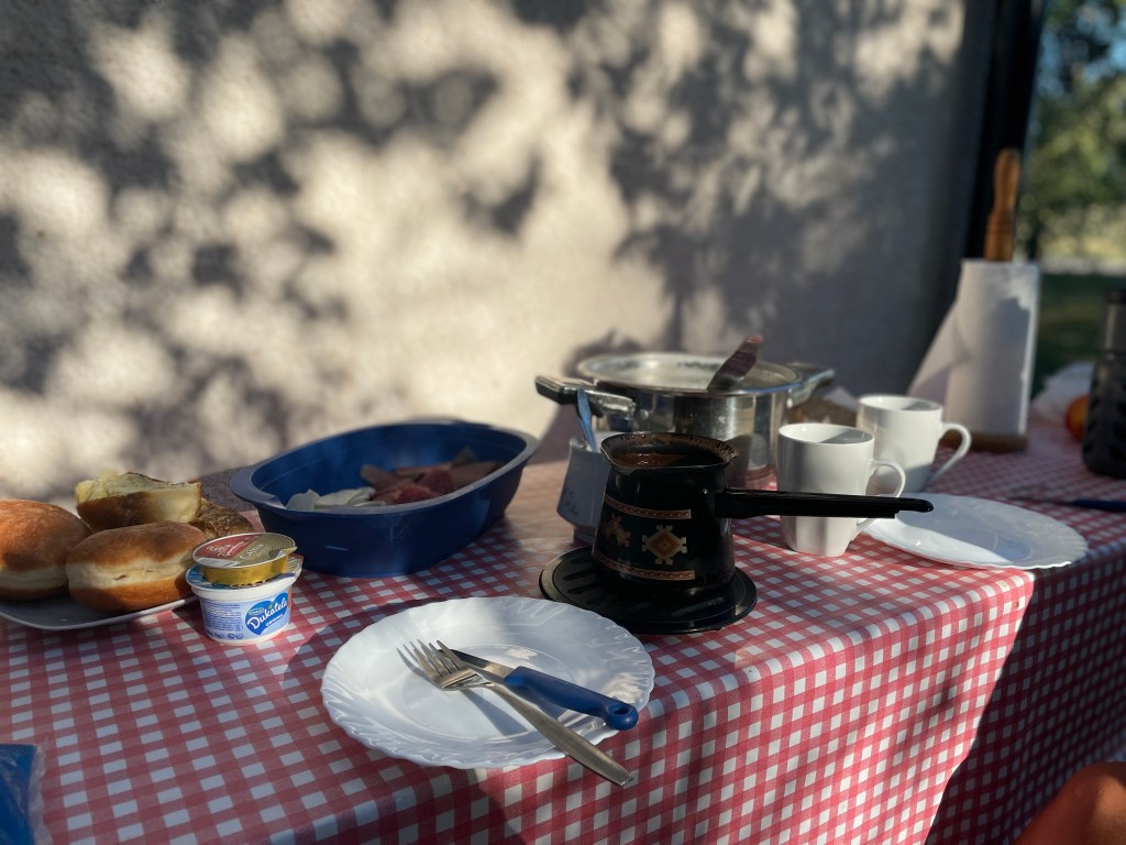 Wenig Worte, aber so viel Herz: Unsere Bäuerin hat heute Morgen nochmal aufgetischt. Auf der Tafel: Speck, selbstgemachter Käse, Brot, Strudel, Berliner und Kaffee. Dazu ein Kochtopf voller Kuhmilch mit Haut. Die dazugehörigen weiß-braunen Ladies haben wir gestern schon kennengelernt.