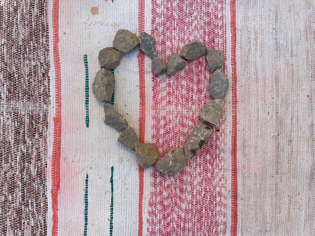Danach braust sie mit ihrem Auto zum Arzt. Wir räumen in Ruhe unsere Zelte ein. Irgendetwas möchte ich ihr geben und sammele ein paar Steine. Von Herz zu Herz.