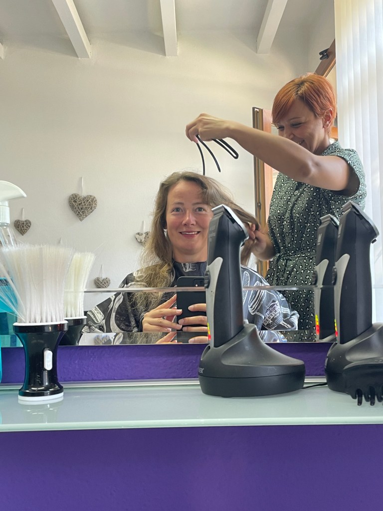 Der Hauptgewinn geht noch weiter: Um 10 Uhr schneie ich in den Friseursalon ihrer Tochter rein. Einmal windschnittiger, bitte! Es geht ratzfatz. Für umgerechnet etwa 6,50 Euro bekomme ich einen freshen Schnitt und noch eine 300g-Milka-Schoki geschenkt. Hat sich wohl rumgesprochen, dass wir viel verdrücken können. Wir lassen uns zum Schluss noch die Adresse der Mutti geben. Ann-Sophie und ich werden ein fettes Schlemmerpaket aus Freiburg losschicken. Im November dann.
