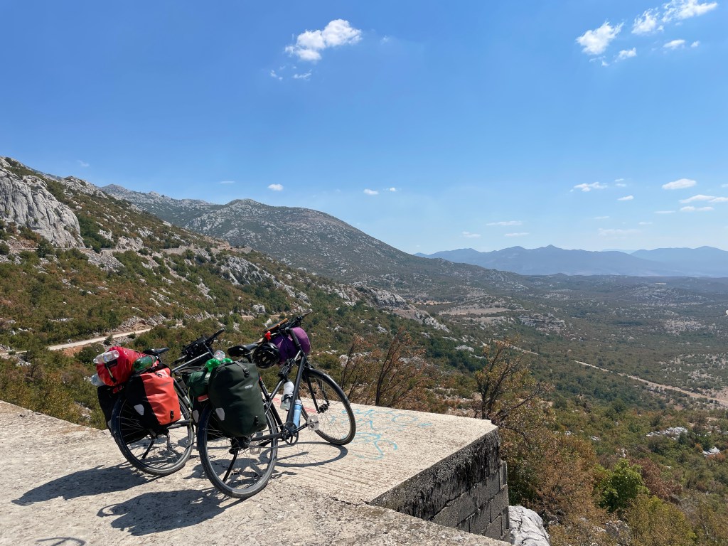 Unser Weg führt uns durch die Ausläufer des Velebit-Nationalparks. Winnetou-Land. Felsen, Weite, brennende Sonne. Knallrotes Gesicht, aber der Kreislauf bleibt stabil. Am Ende tauchen wir ab, in einem See, kurz vor dem Meer. Hier übernachten wir auch, bei „Hotel Fledermaus“. Ein total unkomplizierter Campingplatz im Naturschutzgebiet. Geheimtipp!!