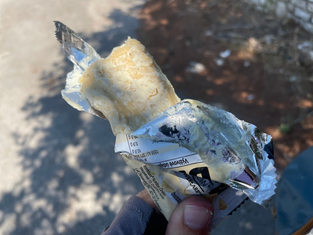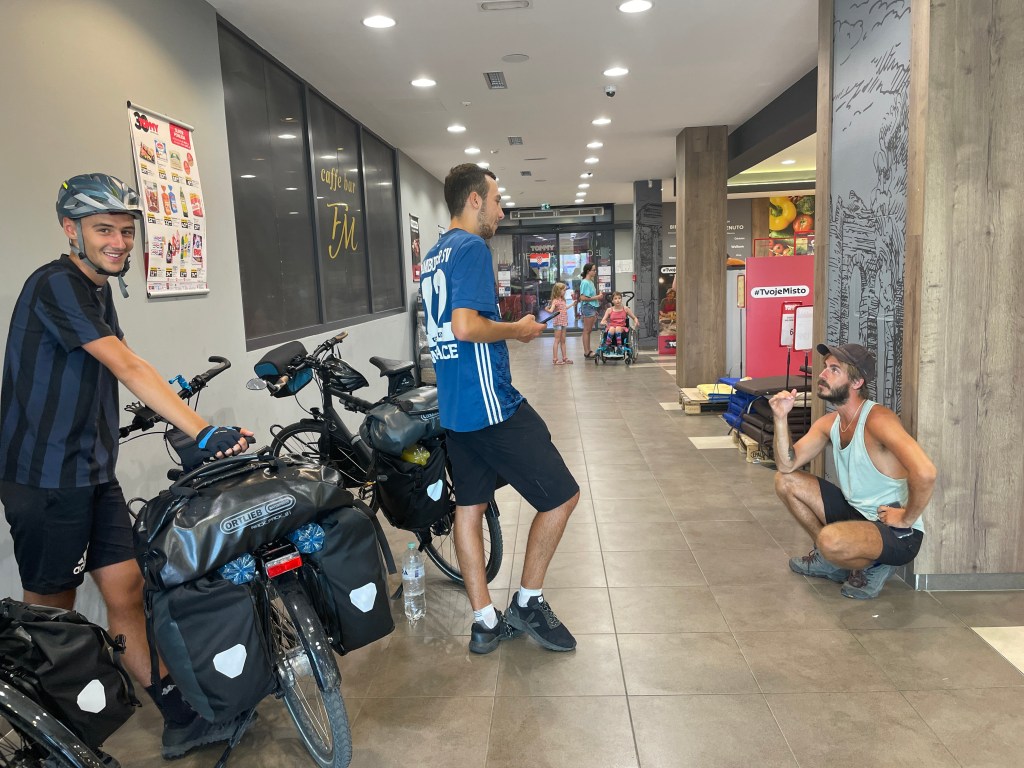 Der EuroVelo8-Radweg und seine Gesichter. Ist schon kurios, aber manchen begegnen wir immer wieder. Die Boys, mit denen wir gestern gezeltet haben, treffen wir in einem Supermarkt wieder. Beim Abschied heute Morgen sagten sie noch: „Ihr findet uns bei den Backwaren“. Wie wahr. Bei den Kassen lernen wir auch endlich Mike kennen, schon jetzt eine lebende EuroVelo8-Legende. Er fährt oberkörperfrei und ohne Helm. Wegen seines gebrutzelten Teints haben Ann-Sophie und ich ihn „Mike brûlé“ getauft. Ich bin so aufgeregt, ihn endlich zu treffen. Er kommt wohl aus den Niederlanden und postet regelmäßig Stories auf Instagram. Zuletzt waren ihm Eier und Milch in der Radtasche ausgelaufen. Sah aus, wie frisch reingekotzt. Dieses Malheur hat ihn aber nicht davon angehalten, wieder eine 10er-Eierpackung auf das Supermarkt-Fließband zu legen. Bin gespannt, wann sich unsere Wege wieder kreuzen.