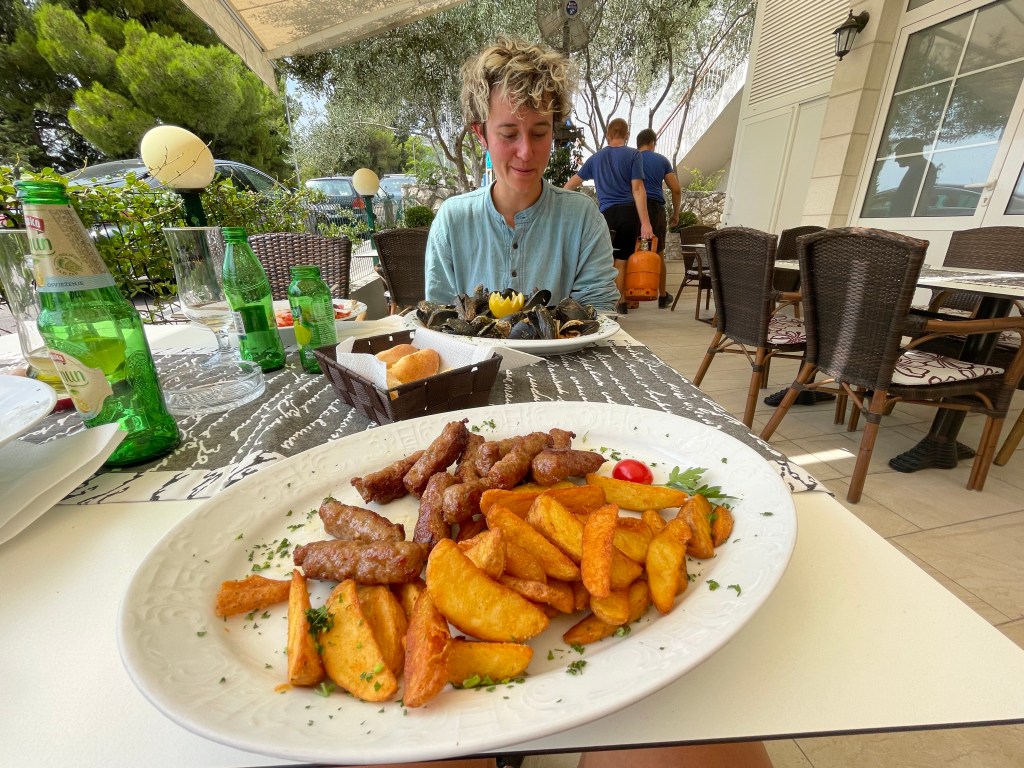 Für umgerechnet sieben Euro knabbere ich an Kartoffeln und Ćevapčići. Die Hackfleischröllchen sehen aus wie abgehakte Finger. Mein Appetit lässt sich davon aber nicht aufhalten. Danach meldet sich wieder das Fresskoma. Ann-Sophie und ich verziehen uns in einen klimatisierten DM. Preise vergleichen. Deos und Zahnpasta sind etwas teurer. Proteinriegel etwas grünster als in Deutschland. Wir decken uns für die nächsten Tage ein.