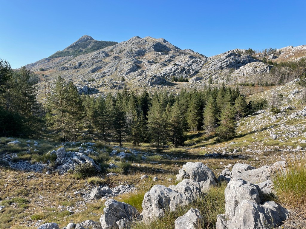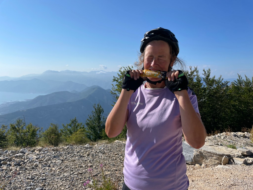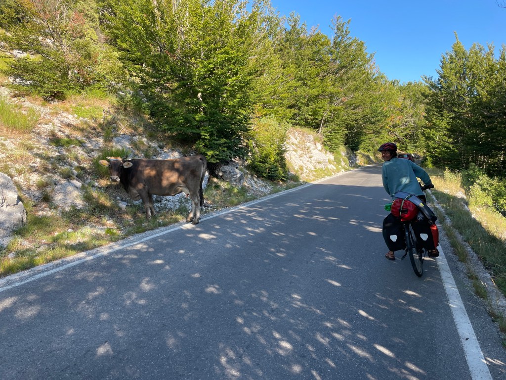 Die Haare fettig, die Sonnencreme verschmiert, das Kettenöl am Bein: Wir. Dusche. Dringend. Auf dem Weg zum nächsten Supermarkt genießen wir die Abfahrt durch Felsenländ alias Nationalpark Lovcen. Achtung, Kuh auf Fahrbahn.