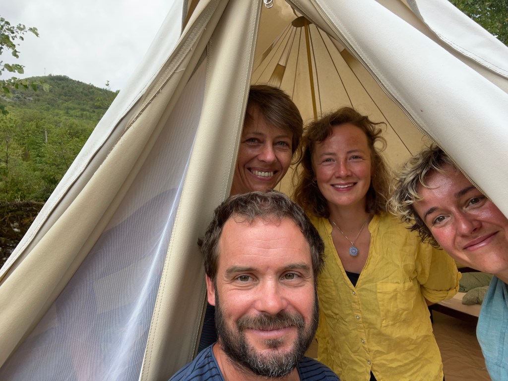 Bett, Decke und Kopfkissen: Das ist schon etwas Feines. Und dann auch noch in einem Tipi. Kristina und Arnaud, ein Radel-Pärchen aus der Schweiz, haben uns gestern zu sich ins Zelt eingeladen. Wie wunderbar. Zumal es heut morgen total geplätschert hat. Blitze, Donner, Regen-Fontäne. Wir sind im Trockenen und unser Stuff auch.
