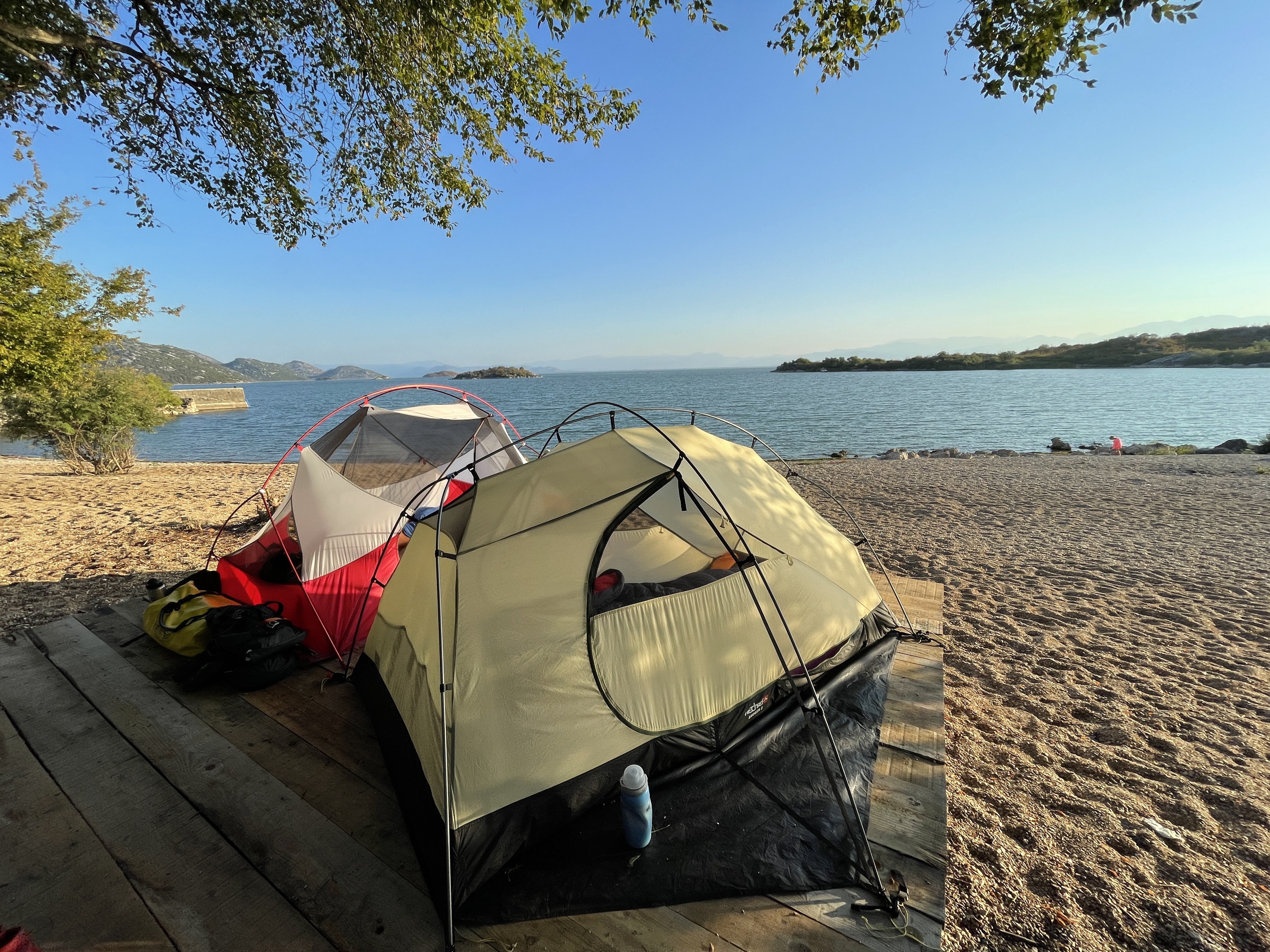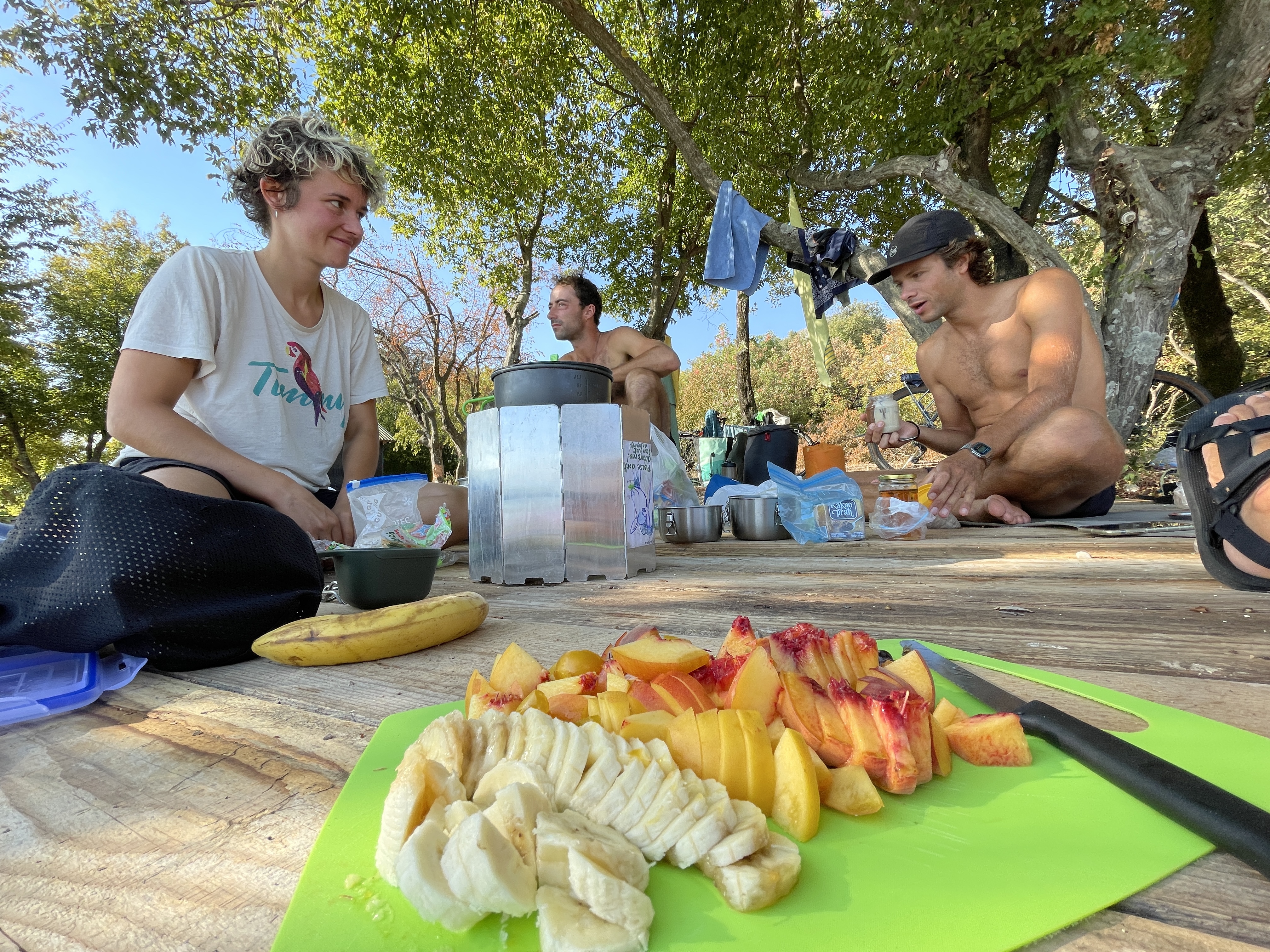 Am Abend haben wir ein Rendezvous mit Pax und Romain. Die beiden Frenchies sind vor zwei Monaten aus Grenoble losgedüst. Gestern haben wir uns zufällig getroffen und eine Kochsession für heute ausgemacht. Am Skutarisee. Zwischen Montenegro und Albanien. An unserem Treffpunkt gibt es überhaupt keine Supermärkte. Gefuttert wird also, was unsere Radeltaschen zerquetscht hergeben: Soja-Würfel, Tofu, Nudeln, Pesto Früchte und Kekse. Keine haute cuisine, aber trotzdem délicieux.