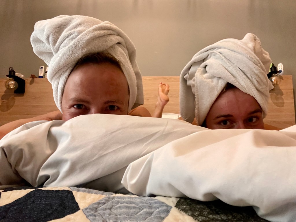 Hier melden sich die zwei Radel-Nixen aus dem Hotelzimmer in Tirana. Pediküre und Haarkur liegen schon hinter uns. Vielleicht kommt gleich noch eine Maniküre-Einheit. Die Minibar? Bisher untouched, aber vielleicht nicht mehr lange.