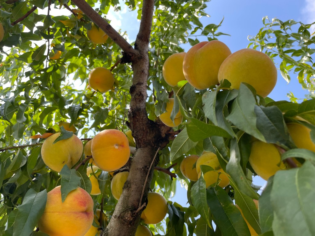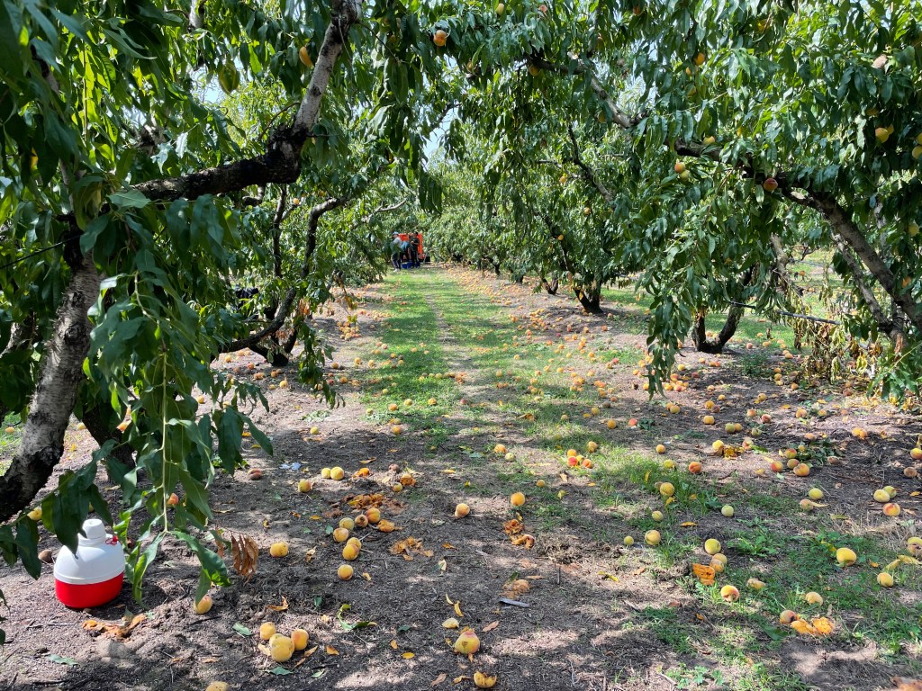 Der Morgen bescherte uns eine steile Bergpartie, natürlich mit Gegenwind. Nach der Kuppe wurde aus der steifen Brise ein Lüftchen. Geht doch. Am Wegesrand, überall Obstbäume. Nordgriechenland, ein großer, süßlich duftender Pfirsichgarten. Wir picken die tennisballgroßen Früchte auf und beißen rein. Hmm, frische Ware!