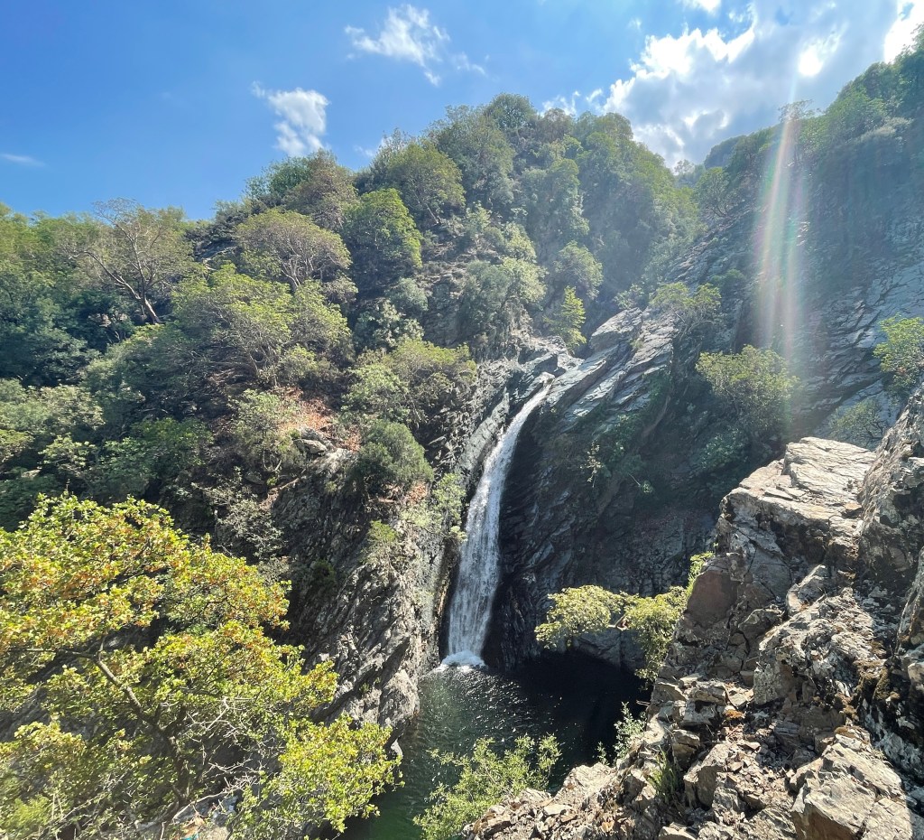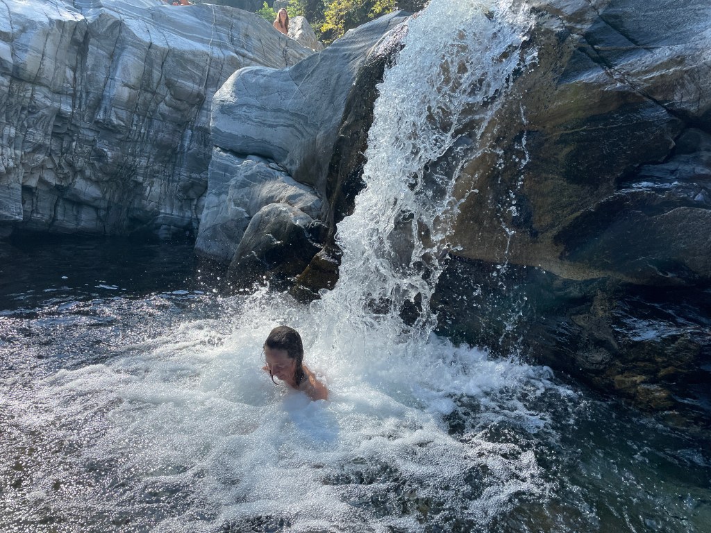 Ein paar Schritte runter in der Schlucht – halb kletternd, halb auf allen Vieren – schwappt ein kleiner Wasserfall in eine naturgeformte Badewanne. Fußsohlen, Waden, Po, Rücken – alles landet unter dem Power-Strahl und wird total durchgeschlackert. Hochdruckreiniger und Massagegerät in einem. Mein Badehöschen fetzt es fast weg. Lebensverlängernd!