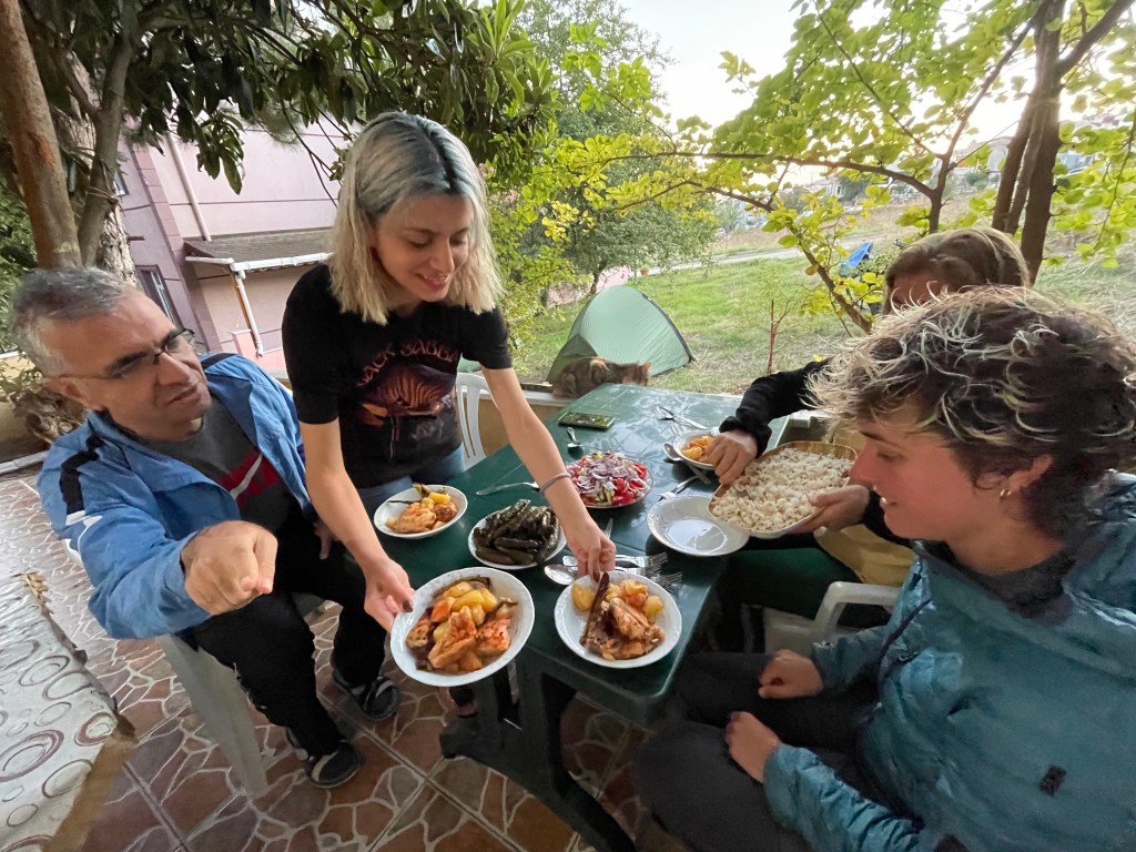 In einem Städtchen an der Autobahn werden wir von einer netten Familie eingeladen. In ihren Garten. Und zum Abendessen. Wir lernen immer mehr türkische Wörter. Zum Beispiel „Teşekkürler“ (teeschökölasch). Das heißt „Danke“. Wieder werden wir überschüttet mit Essen und Herzlichkeit!