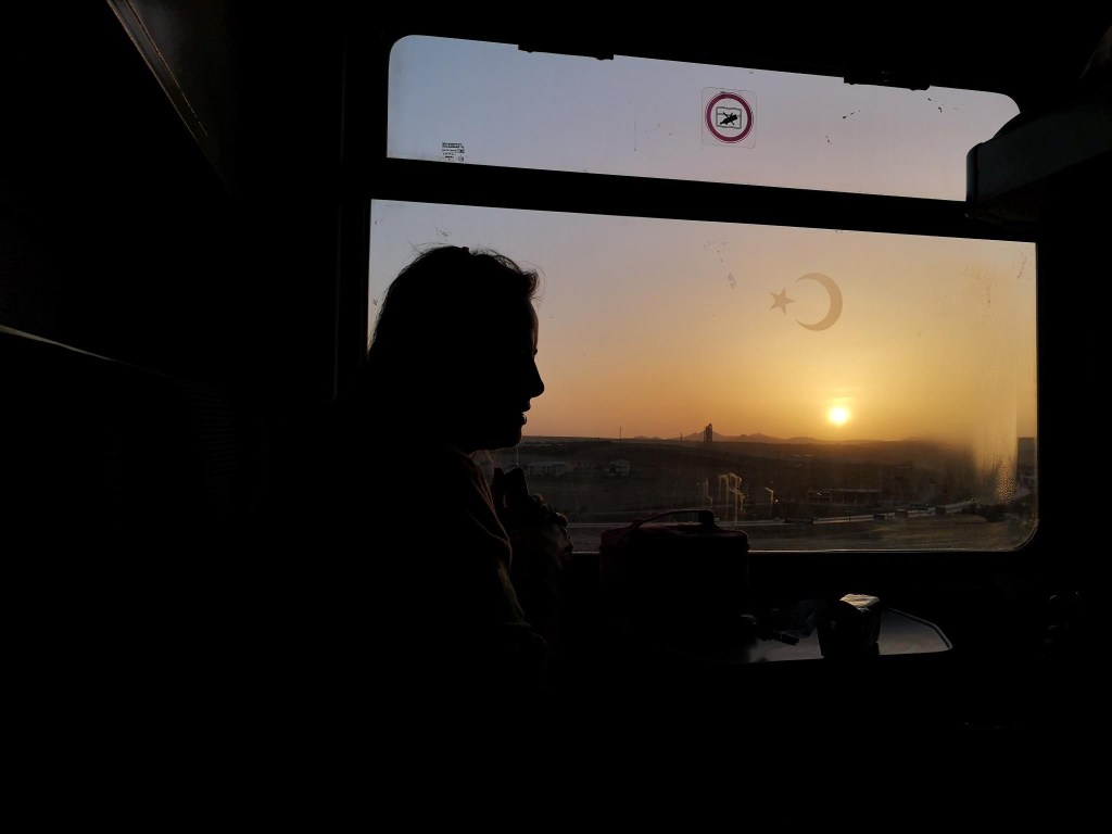 Um fünf vor sechs an Bahnsteig 1 (Ankara) geht die Reise los. Wir fahren! Alles zieht an uns vorbei. Die Hochhäuser, die Autobahnen, der Lärm. Wir hocken auf großen, blauen Sesseln in unserem Abteil. Fühlt sich an wie ein Kokon mit Ohropax. Uns gegenüber ein junges Mädel und eine kommunikative, ältere Dame. Fünf Minuten nach Abfahrt grabbelt die Lady schon in ihrem Proviant-Koffer und zieht einen Beutel in Tragetaschen-Größe heraus. Darin Sonnenblumenkerne mit Schale. Wir knacken das Gehäuse, lutschen die Kerne heraus und freuen uns so sehr, dass wir noch zwei Plätze im Schlafwaggon bekommen haben. Das Glück hat schon wieder vorbeigeschaut.