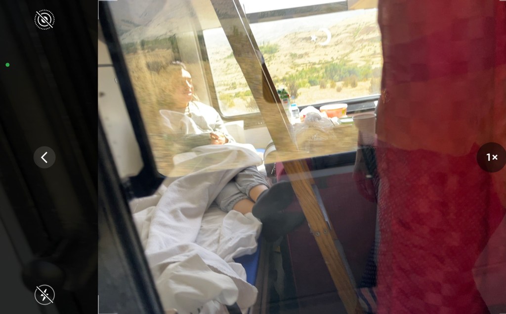Kurz darauf kommt einer der Schaffner zu uns und drückt uns weiße Pakete in die Hand. Handtücher vielleicht? Nee! Eine Bettdecke, ein Bettlaken, Kopfkissen und einen Bezug. Das wird ja richtig gemütlich hier! Wir klappen die Sitze um und beziehen unsere Gemächer. Noch einen Tee im Bordbistro und dann in die Horizontale. Es schunkelt so schön. Mal sind Glocken zu hören. Immer bei Bahnübergängen. Nächster Halt: Träume!