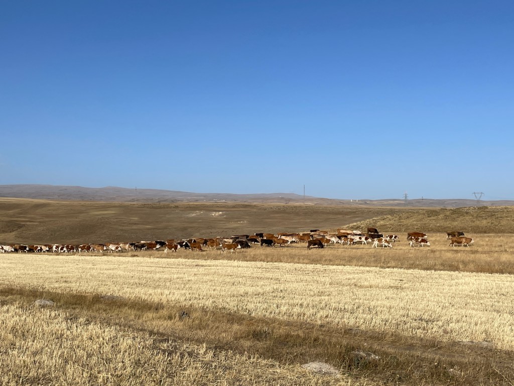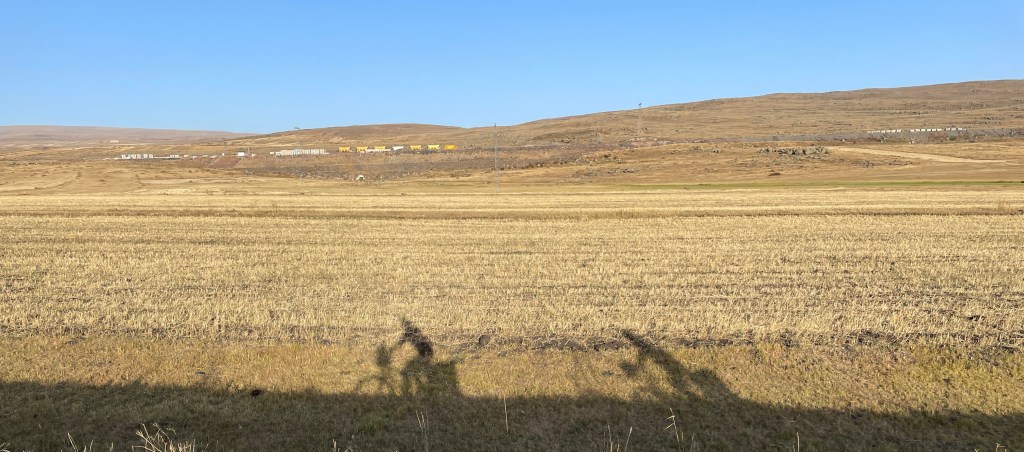 Der Koch will noch ein Photo mit uns, dann rauschen wir wieder ab. Das Licht wird immer wärmer. Die Farben satter und die Landschaft unwirklicher. Ich habe noch nie so viele Gelb-Töne gesehen. Die raspelkurzen Weizenfelder, die Strohpyramiden, das angeleuchtete Gestein und dann noch der gelbe Mittelstreifen auf der Straße. Es ist so unfassbar schön. Wie ein anderer Planet. Wir sind auf 2.000 Meter Höhe. Hier wächst kein Baum mehr. Vereinzelt immer wieder Hütten und kleine Häuser. Viele Kuh- und Schafherden mit einem einsamen Bauern an der Seite, der sein Cappy lupft, wenn wir vorbeifahren.
