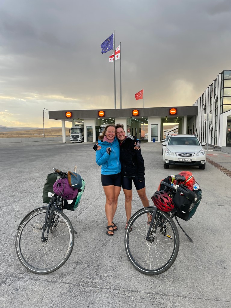 Noch einmal den Berg hoch und bisschen geradeaus, dann taucht er plötzlich auf, mitten in der Pampa – der Grenzübergang ins lang ersehnte Land, Georgien! Die Grenzer sind locker drauf. Lassen uns einfach durchfahren, ohne in die Radtaschen zu schauen. Zum Glück! Ich habe zum Beispiel eine angebrochene Konserve mit Tomatenmark am Start. Die Plastiktüte drumherum ist auch schon bisschen rot verschmiert. Könnte für Irritationen sorgen…Aber alles easy.