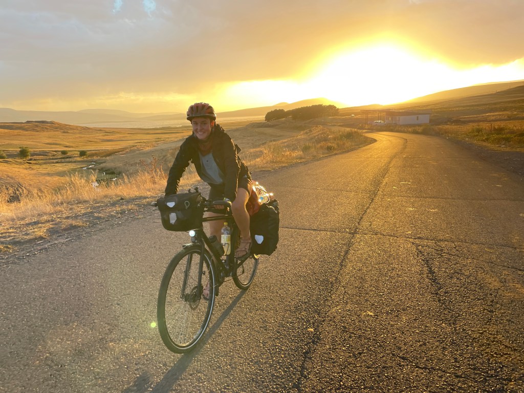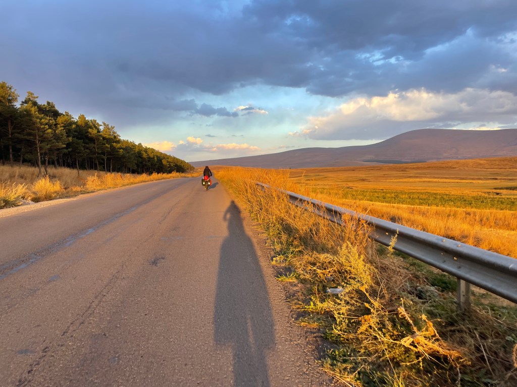 Ann-Sophie und ich umarmen uns, trinken einen Schluck Schnaps (Geschenk von Leuten aus Kroatien) und schieben uns Kekse rein. Wir haben es wirklich geschafft! Freudentänze und Grinsebacken-Faces! Jeder wartende Trucker wird angestrahlt. Das Licht ist auch so absurd schön. Alles mit Gold überzogen! Wir radeln schon nicht mehr, wir schweben schon!
