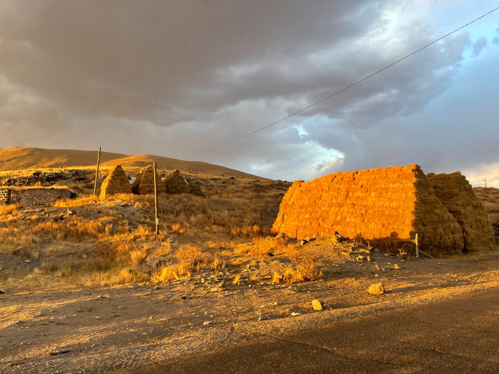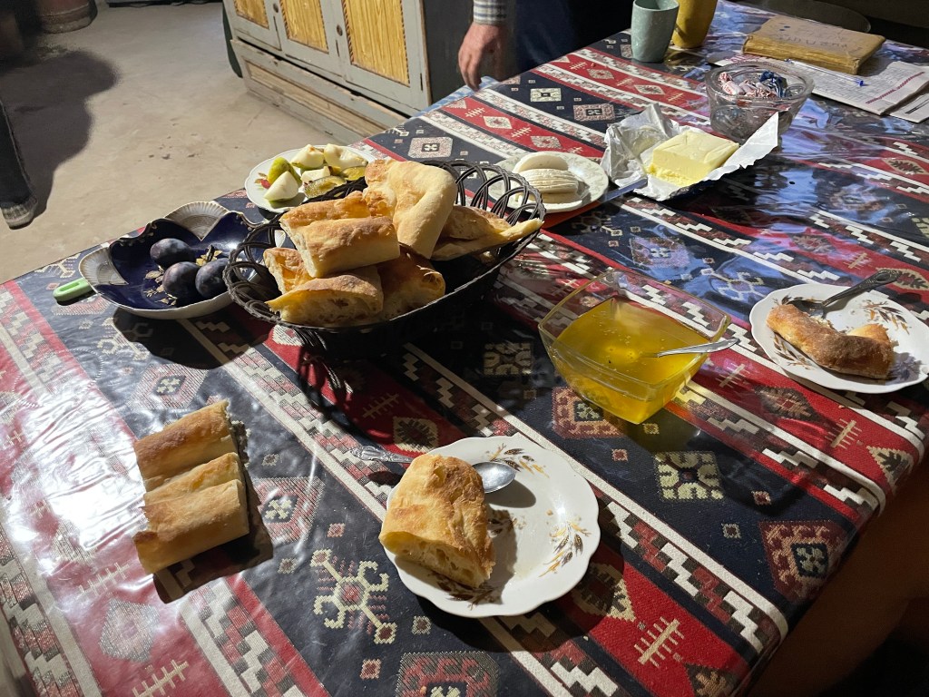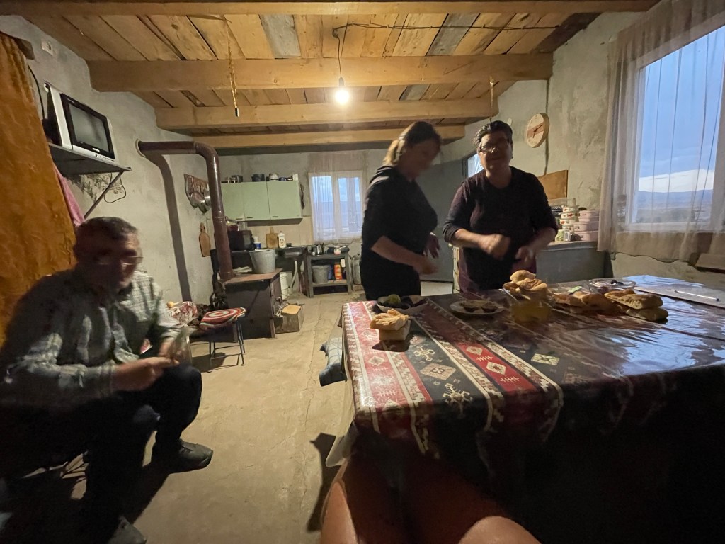 Im ersten Dorf hinter der Grenze quatschen wir wieder Leute an. Ruckzuck öffnen sich Türen und Herzen. Eine Familie lädt uns zu sich ein. Wir sagen, dass wir sehr viel zum Mampfen dabei haben. Keine Chance! Die Omi tischt in Sekundenschnelle Fladenbrot, selbstgemachten Honig und Käse auf. Vollverpflegung!! Die Großeltern, der Urgroßvater und die Schwiegertochter (Mann und Tochter werktags in einer größeren Stadt) leben in einem Haus, nutzen aber eine kleine Hütte zum Kochen und Kreuzworträtseln. Da dürfen wir auch schlafen. Es ist so gemütlich. Draußen weht der Winter schon heran und hier drinnen ist es sehr behaglich…gute Nacht!