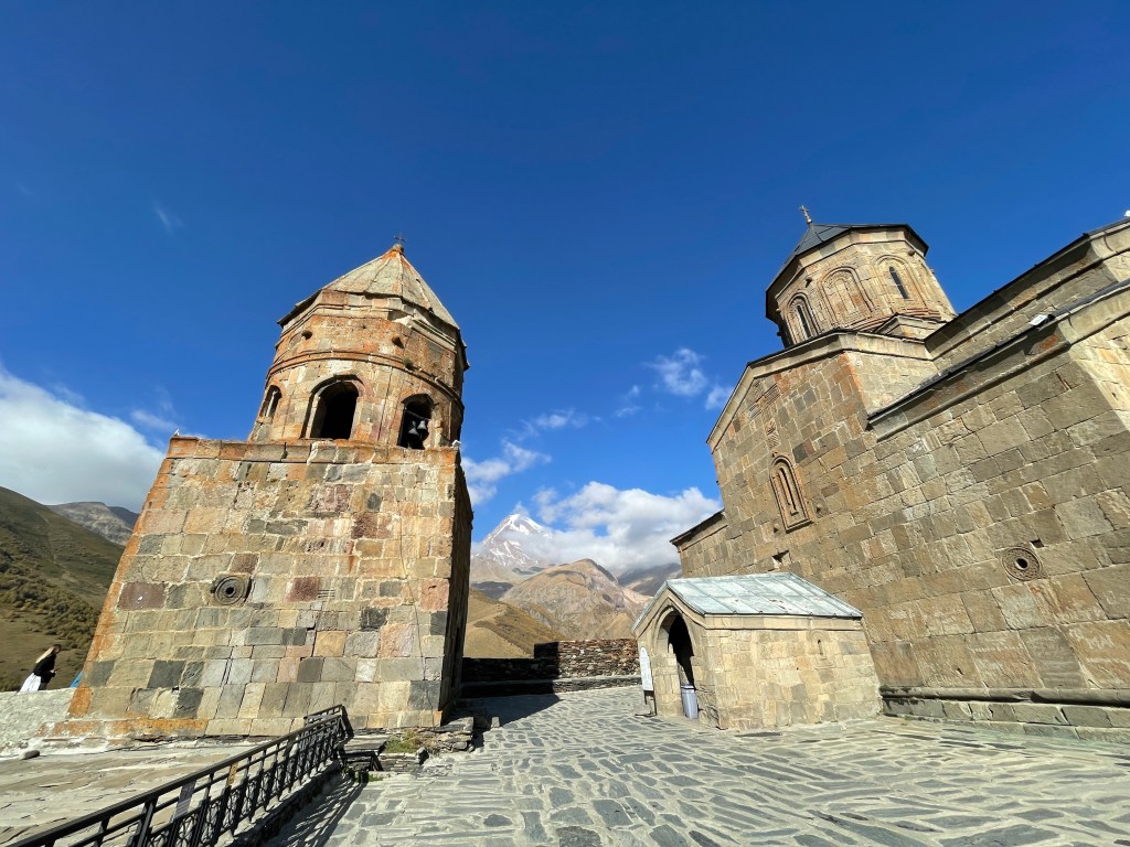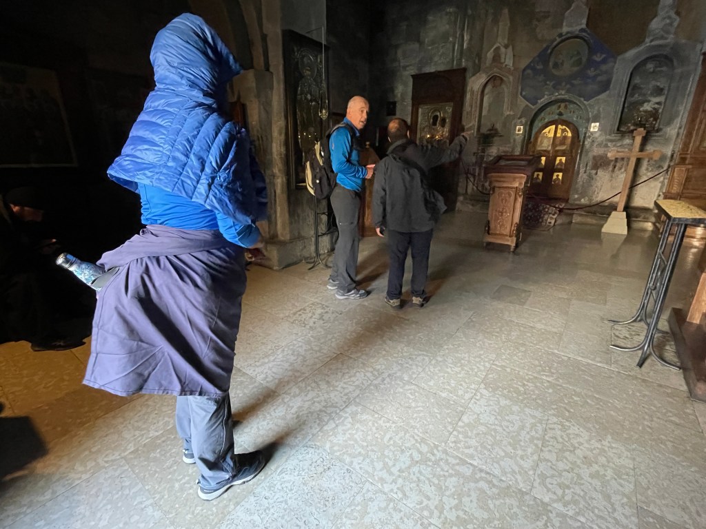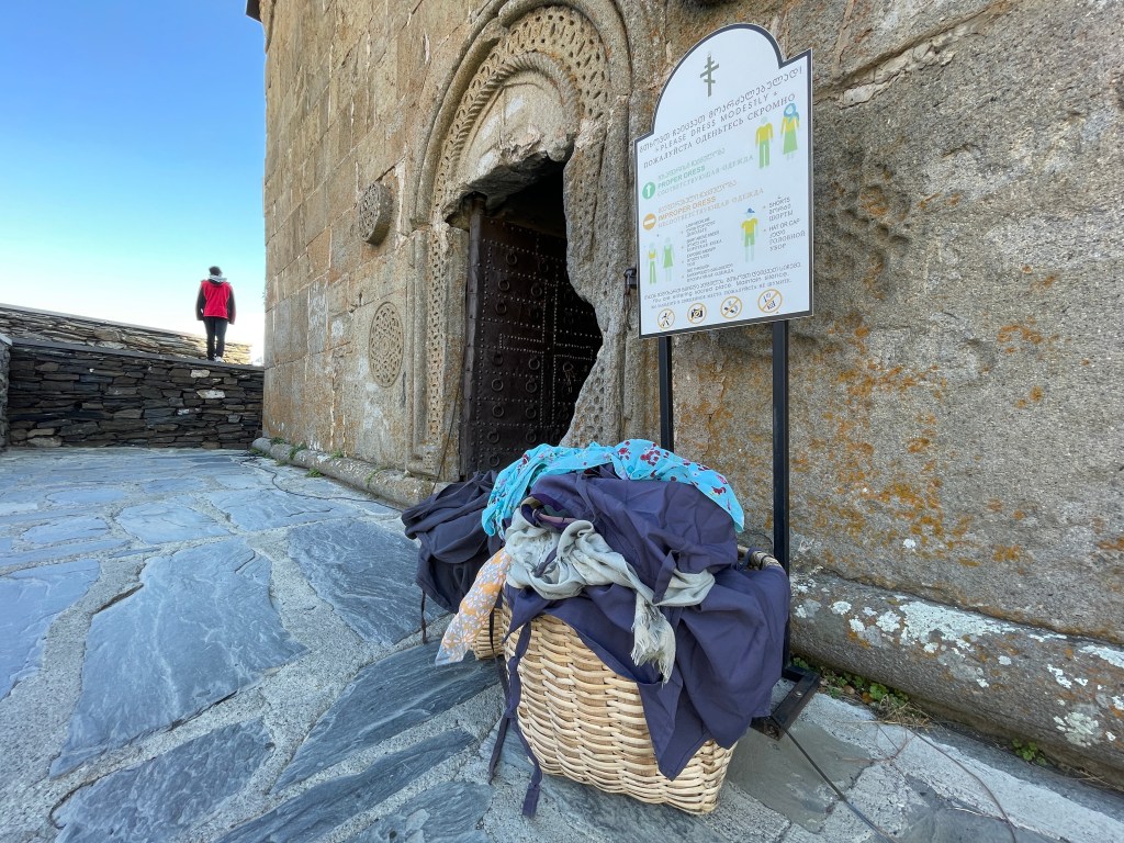 Jetzt aber mal zur Diva im Vordergrund des Kazbeks: der Wallfahrtskirche Gergeti. Aus dem 14. Jahrhundert. Ehrwürdige Lady! Mit Dresscode! Kurze Hosen sind verboten. Frauen müssen Rock und Kopftuch tragen. Ein Korb mit „Equipment“ wartet vor der Kirchentür. So manche Touristin verwandelt sich dabei unabsichtlich in eine Karikatur ihrer selbst. Der aufpassende Mönch (?) neben dem Eingang behält jedenfalls die Contenance und liest stoisch auf seinem Kindle.