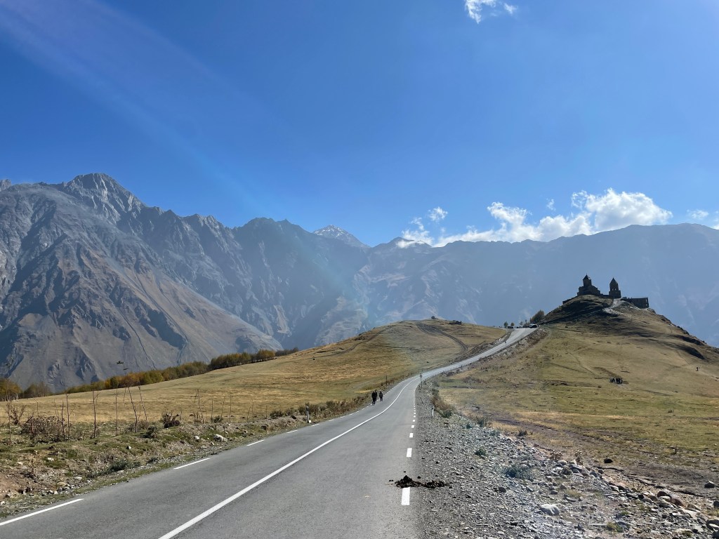 Um kurz nach 8 Uhr mache ich auf die Socken. 400 Höhenmeter. Sonne im Rücken und freie Sicht auf den Kasbek. Georgiens zweithöchsten Berg. Mehr als 5.000 Meter hoch. Prometheus soll hier ganz schön Trouble gehabt haben. Göttervater Zeus kettete ihn nämlich auf dem Gipfel an – als Strafe, weil sein Söhnchen das göttliche Feuer zu den Menschen gebracht hatte. Zu allem Übel knabberte ein Adler immer wieder die prometheuische Leber an, die sich zwar erneuerte, aber trotzdem: bloody hell!