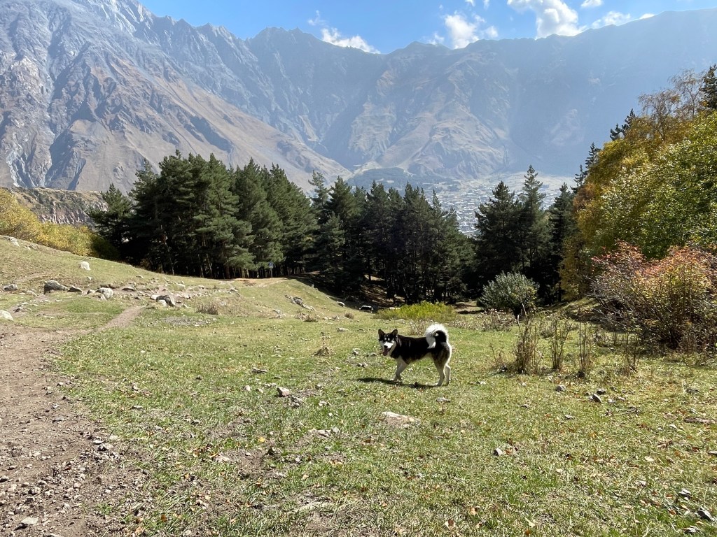 Nach fünf Kilometern und vielen Serpentinen verschwindet er wieder. Irgendwo im Wald. Schade, treuer Freund auf Zeit! Was ich Oli später erzähle: Das Beste an der Gergeti-Kirche war der Hund!