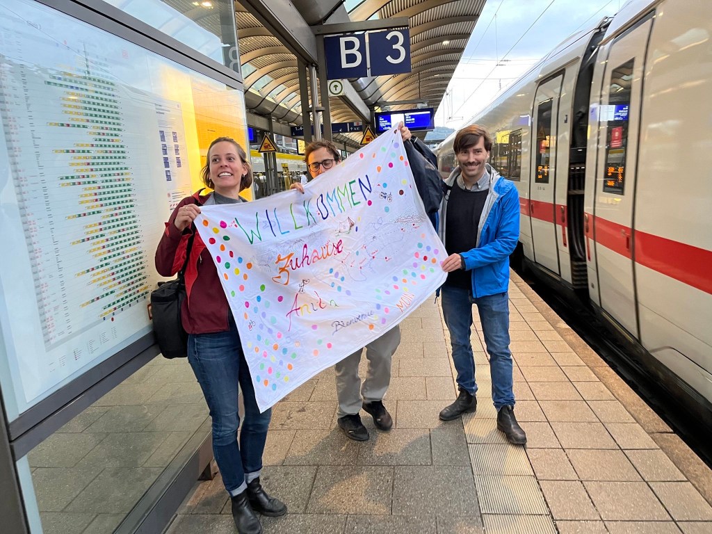 „Nächster Halt: Freiburg im Breisgau“! Eine furztrockene Durchsage für einen feierlichen Moment. 16 Stunden durch die Luft getingelt. Von Tiflis über Istanbul nach Frankfurt. Fahrrad am Flughafen wieder zusammengeschraubt, mit dem ganzen Gerödel in die Bahn gestiegen und dann „Ausstieg in Fahrtrichtung links“! Angekommen. Gänsehaut und Tränen. Denn ich bin nicht allein auf dem Bahnsteig – abgesehen von Oli. Ann-Kathrin, Hanna, Nino, Benny, Lars und Gesa strahlen mich an. In ihren Händen eine bemalte Tischdecke: „Willkommen zuhause Anita“. Ich muss richtig flennen. Umarme alle. Einmal, zweimal, dreimal. Es gibt Sekt. Ich rede wirres Zeug. Nur Freude. Überall. Vom kleinen Zeh bis zum Zopf.