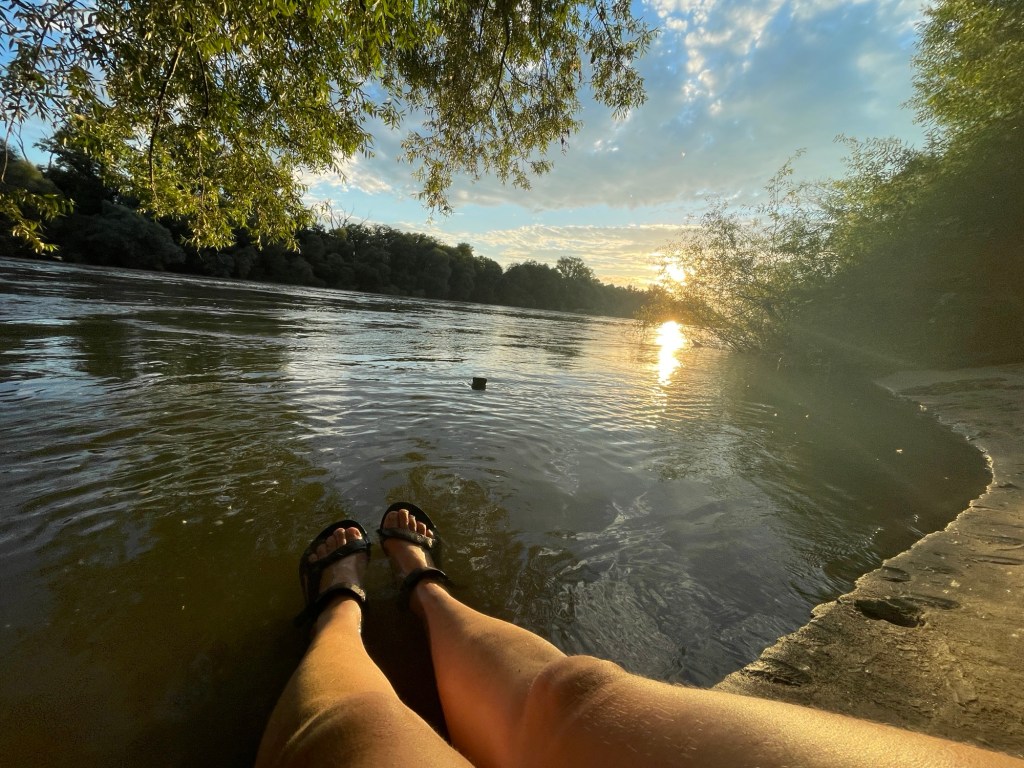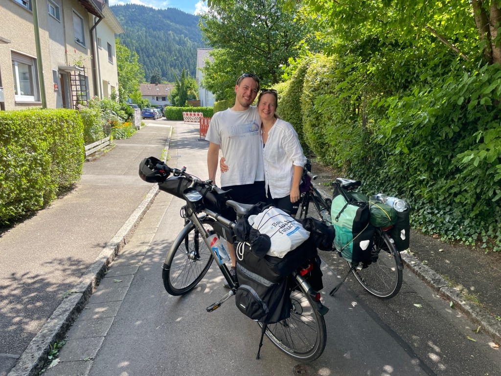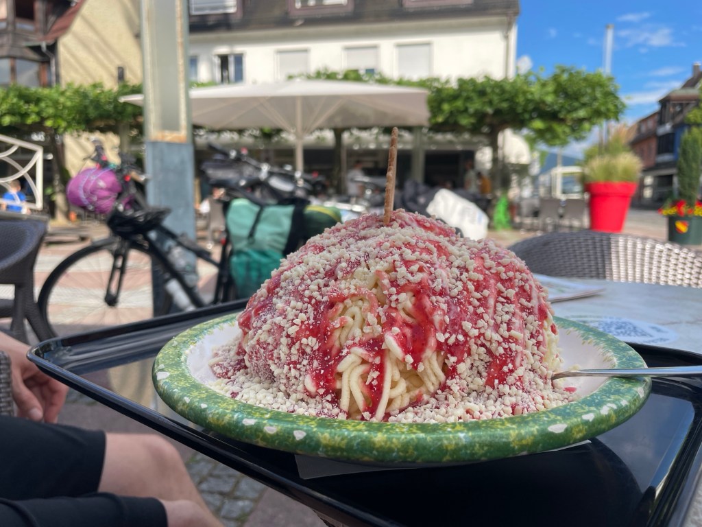 Die Beine strampeln, aber der Kopf hängt noch im Büro. Schilder und Kilometer ziehen an uns vorbei. Mit jedem Kurbelschwung verblast der Stress der letzten Wochen und das Abenteuer-Gefühl fließt ins Blut. Und die Freude über: das dumpfe Platzen, wenn man über Kirschkerne rollt, das Hochschauen zur Kirchturmuhr, wenn man die Uhrzeit wissen will und eine Portion Riesen-Spaghetti-Eis nach den ersten 40 Kilometer. War meinem Freund sehr wichtig.