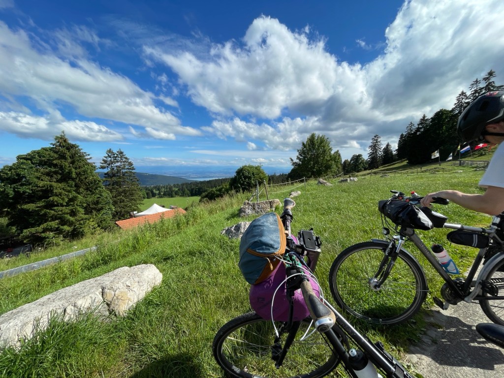 Himmel blau, Schlüppis gewaschen, Schlafakku voll. Es geht weiiiter. Eine schmale Teerbahn schlängelt sich von Kuppe zu Kuppe auf den sogenannten Freibergen im Schweizer Jura. Ein lang gezogenes Hochplateau. Kurvenreich und anspruchsvoll. Wir schnaufen rauf und zischen runter. Fast 900 Höhenmeter. Die Einkäufe bei einer Dorfbäckerei sind schnell nur noch Blätterteig-Fetzen auf dem Asphalt. Zwei Bissen, zwei verpuffte Croissants.