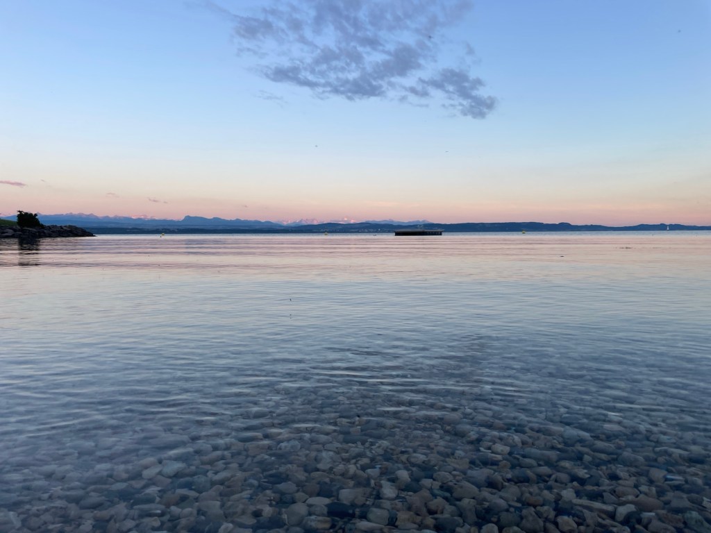 Mit unserem Proviant rollen wir zu einem Campingplatz, direkt am See. Zelt aufbauen, heiß duschen, bisschen Creme ins Gesicht. Das ist Glück. Wir beißen in zwei Schokoriegel und die schneedeckten Alpen glühen im Abendlicht. Danke liebe Beine!