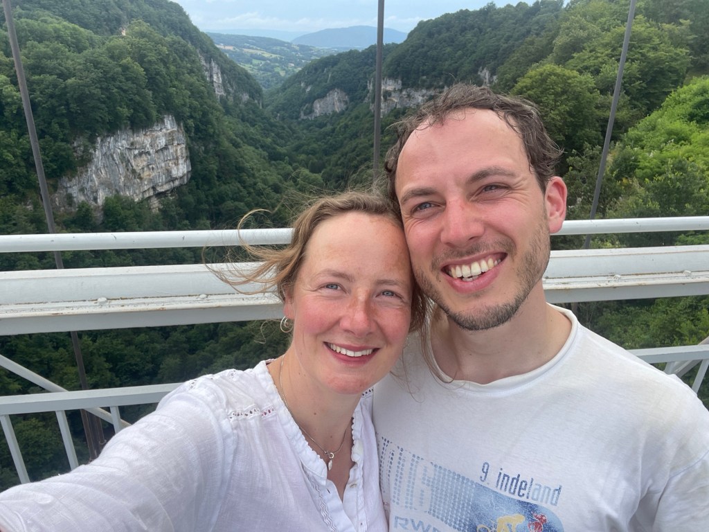 Wir lassen die Schweiz hinter uns und damit auch die ausgesprochen guten Radwege und die Trinkwasserbrunnen in jedem Dorf. Kurz nach der französischen Grenze leeren sich unsere Wasservorräte. Ich spreche einen Oppa in seinem Garten an. Haben Sie bisschen Wasser für uns? Bien sûr! Wir sollen ihm in die Küche folgen. Alles in Eierlikör-Farben. Er dreht den Wasserhahn auf und nicht mehr zu. Ruft noch seine Frau herbei. Sie kann es gar nicht fassen, dass wir nach Marseille radeln. Hält sich immer wieder die Hand vor dem Mund. So herzlich. Völlig getränkt ziehen wir weiter. Im nächsten Kaff muss ich schon auf Toilette. Ein Gebüsch reicht auch. Wir nähern uns Annecy und stolpern über eine einzigartige Hängebrücke – die Pont de la caille. Es geht sooo tief runter. Der Magen hüpft einmal hoch.