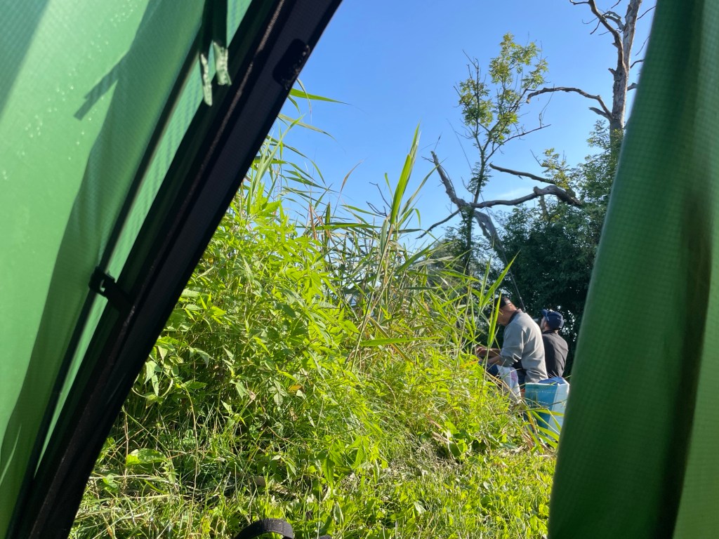 Sicherheitsleute oder Polizisten haben uns letzte Nacht in Ruhe gelassen. Allein waren wir trotzdem nicht. Im Morgengrauen brummen auf einmal zwei Männerstimmen neben unserem Zelt. Dazu ein geräuschvoller Luftschwung. Mein Pippigang löst das Rätsel auf: Es sind zwei Angler – Vater und Sohn – die herumfuchteln. „No kill“, sagen sie sofort. Meinen sie uns oder die Fische? Egal, Hauptsache die tun uns nichts.