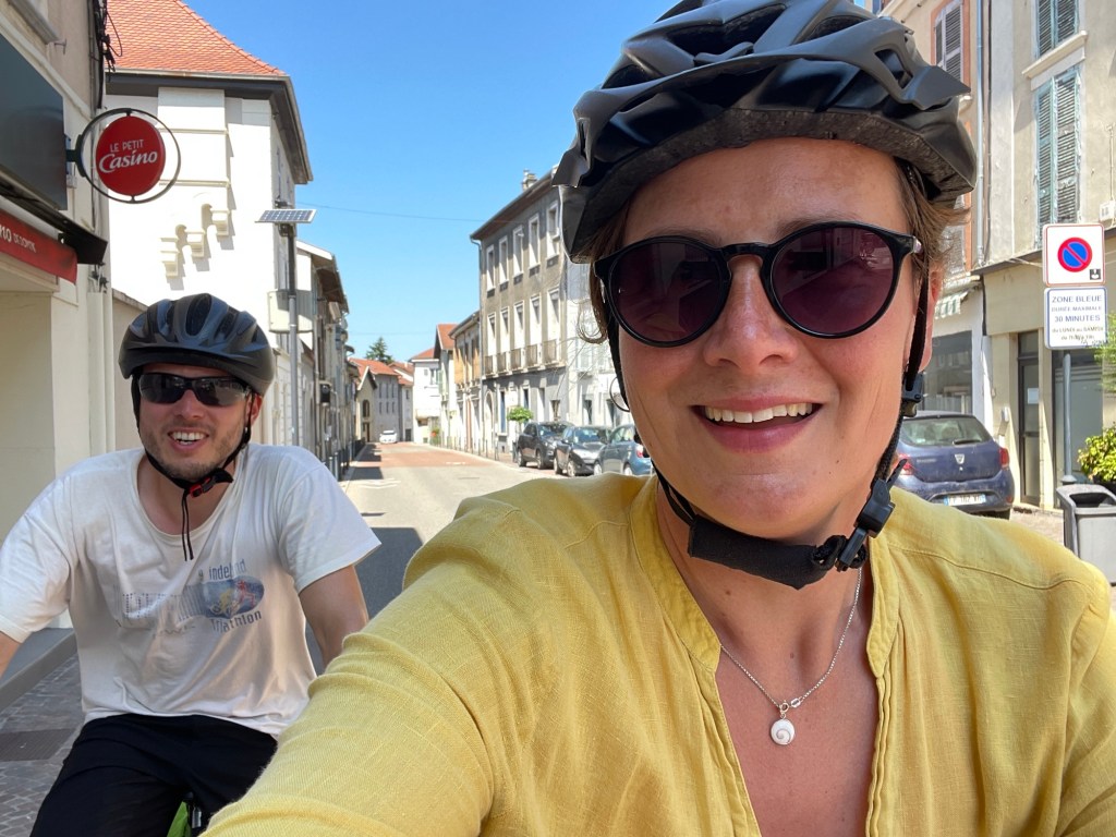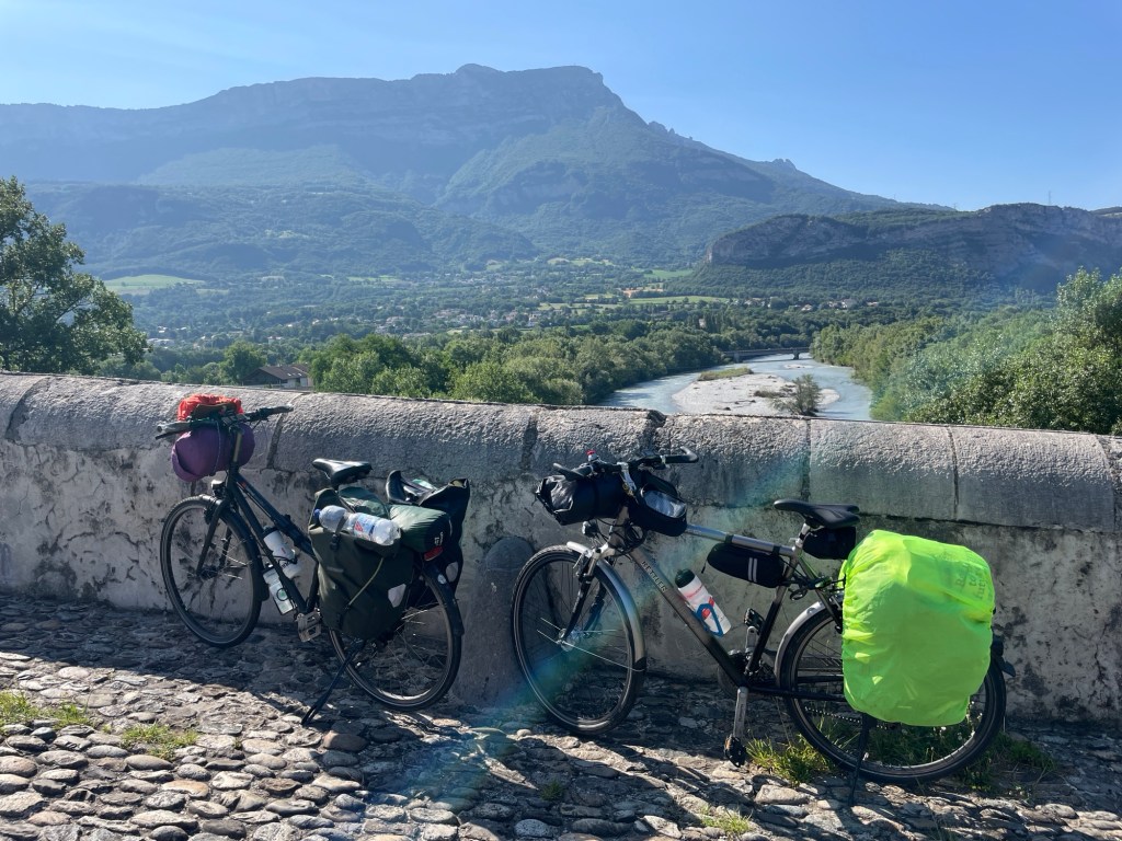 Paniert wie Schnitzel erreichen wir Grenoble. An meinen Beinen klebt ein Best of Straße: Fliegen, Splitter, Schmodder. Da muss ein Hochdruckreiniger her oder mindestens ein Campingplatz. Für nen Zwani für zwei angekokelte Nasen können wir direkt neben dem Vercors-Nationalpark pennen. Ein Berg sieht aus wie ein grünes Toblerone-Stück. Verstreute Rundballen flüstern: Hallo, hier ist der Sommer.