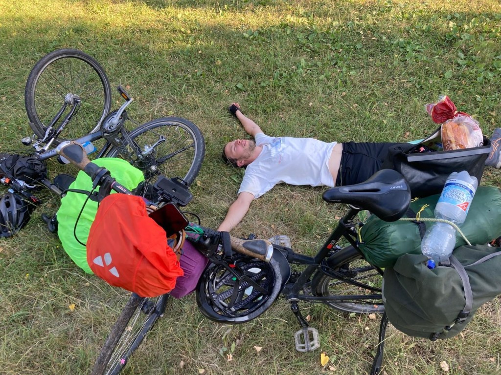 Mit den letzten Schwüngen lassen wir uns zu Melissa rollen. Bei ihren Eltern im Garten bietet sie lässiges Camping an. Wir sollen geben, was wir wollen. Mag ich total als Konzept. Beim Ankommen fällt erst Michas Rad um, dann der Reiter selbst. Und damit ist für heute alles gesagt… 🙂