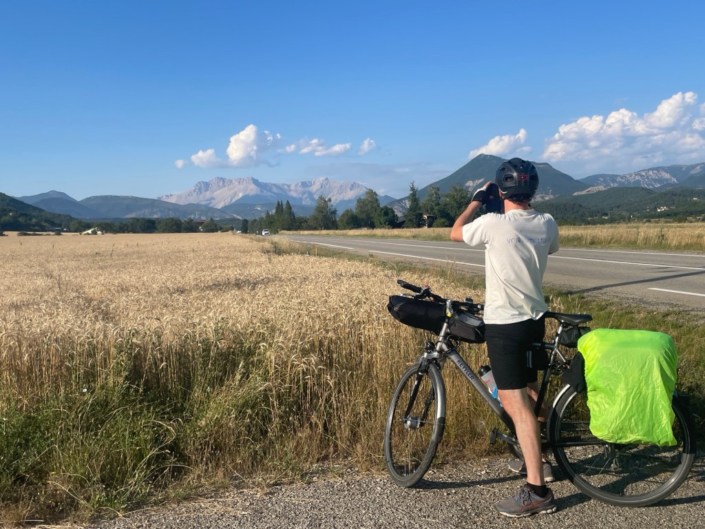 Manche Autofahrer rufen uns „Courage“ zu. Das pusht. Auch die unzähligen Müsliriegel. Die Orangina. Der Käse, der Coleslaw-Salat und die Thunfisch-Dose. Der Kessel muss brennen. Micha gönnt sich noch einen ausgebiegenen Honig-Shot, ich snacke M&Ms in einer der Serpentinen. Gegen Nachmittag erreichen wir endlich the top of the mountains alias le Col de la Haute Croix. 1.200 Meter über dem Meer. Gestartet waren wir bei 260 Metern. Dazwischen: hügelig!