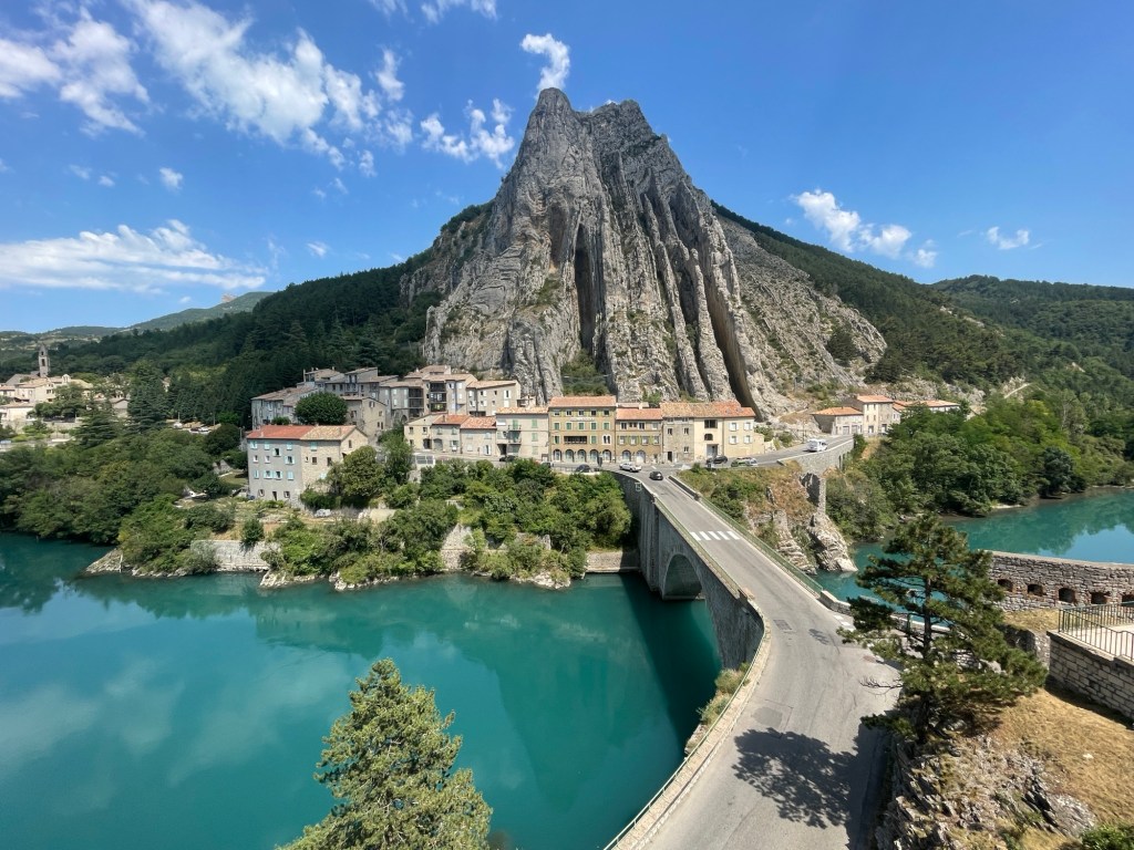 Nach gefühlt 100 Kilometern, tatsächlich sind es nur 50, kommen wir in Sisteron an, ein kleines Städtchen am Fluss Durance. Und da ist er wieder, dieser Moment, dieser Antrieb, warum es gut ist, die heimische Couch verlassen zu haben. „Dat kannste nicht schöner malen“, denke ich so vor mich hin. Dieser Felsvorsprung, dieses leuchtend blaue Wasser. Als wär ein Zaubertrank hineingeplumpst. Einfach nur wow!