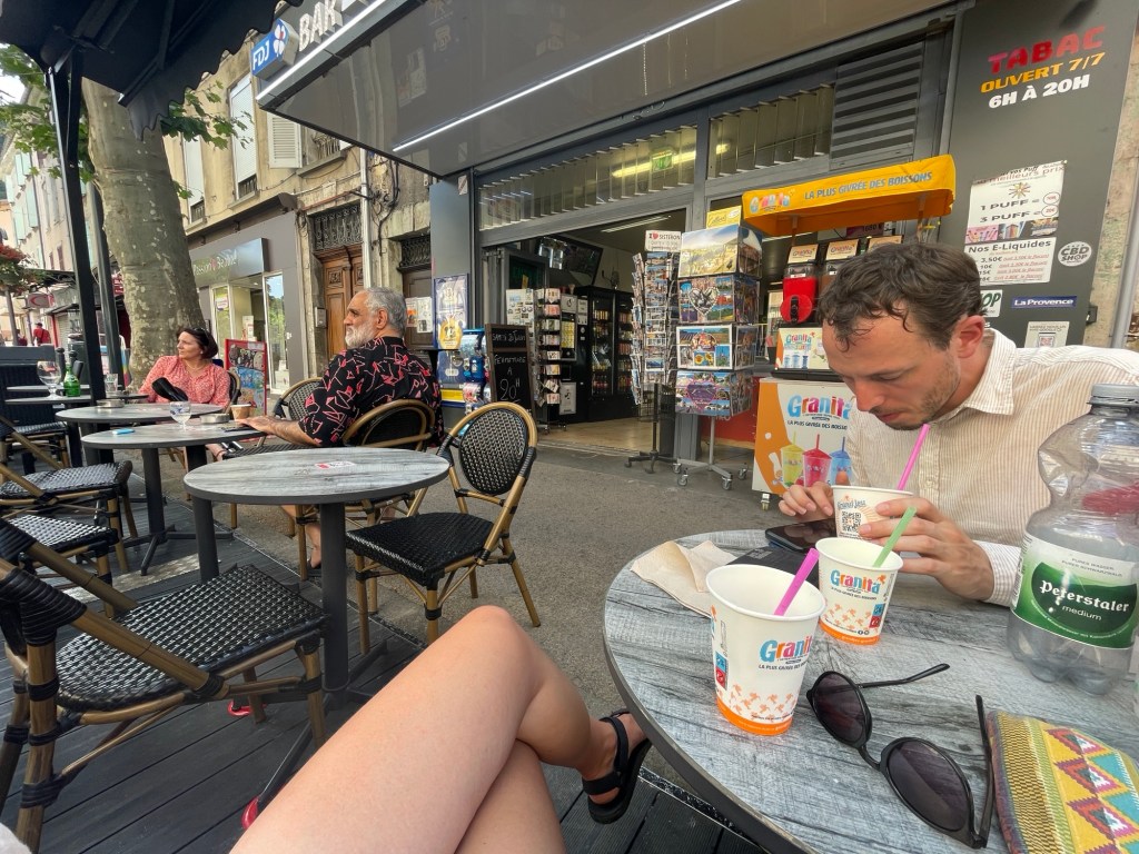 Im Schatten essen wir brav unsere Fischdosen und schleichen dann zu einem Café mit Slush-Eis. Das Zeug tut so gut. Irre kalt, süß und sehr viel. Für mich tropical blue, für Micha Erdbeer-Cola-Tropen gemischt. Eine halbe Stunde am Strohhalm schlürfen und die Crowd beobachten. Einer gönnt sich Pastis, eine ältere Dame hat ihre Krücken am Start. Ein weiterer Herr trägt unter der Jogginghose wohl einen Katheter. So fertig wie wir aussehen passen wir gut hier hin. Kaputt aber sehr herzlich, die Leute. Der Barkeeper zapft uns zum Abschied noch eiskaltes Wasser in unsere unzähligen Flaschen.